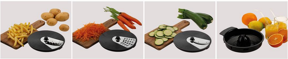 Sada troch vymeniteľných antikorových diskov na krájanie a strúhanie je spoľahlivým pomocníkom pre každého, kto ocení rýchlu, presnú a pohodlnú prípravu surovín. Disky sú vyrobené z kvalitnej antikorovej ocele, ktorá zaručuje odolnosť, ľahkú údržbu a jednoduchú manipuláciu. Vďaka tomu sú skvelou voľbou na pravidelné varenie aj prípravu zložitejších jedál. Výbavu dopĺňa aj lis na citrusy, s ktorým ľahko získate maximum šťavy z každého citróna, pomaranča alebo grapefruitu, bez nutnosti použiť ďalší prístroj.