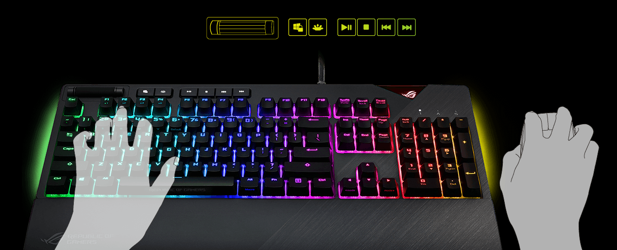 Rozžiarte svoj pracovný priestor živým podsvietením a po oboch stranách klávesnice. Vďaka systému Aura Sync je pre vás pripravené celé spektrum farieb a rad dynamických svetelných efektov, aby ste vytvorili klávesnicu, ktorá žiari vašim jedinečným štýlom. Navyše môže byť osvetlenie Strix Flare synchronizované s rozsiahlym ekosystémom Aura a vytvárať tak prostredie pre hranie, ktorého svetlo neprehliadnete.
