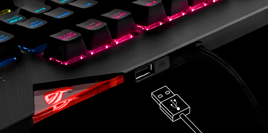 Praktická prípojka USB na zadnej strane klávesnice ROG Strix Flare vám umožní pohodlne pripojiť hernú myš, headset alebo iné zariadenie.