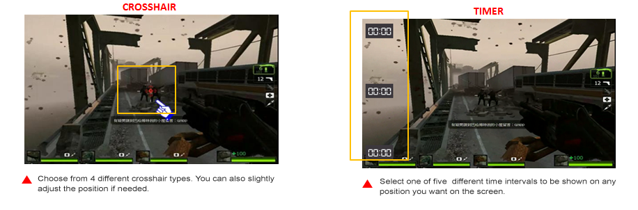 klávesová skratka pre vyvolanie herných funkcií ako zameriavací kríž či časovač. Vyberte si zo 4 rôznych zameriavačov taký, ktorý najlepšie zodpovedá vášmu hernému prostrediu a priamo na obrazovke sledujte ubiehajúci čas vašej hry vďaka prekryvnej grafike.