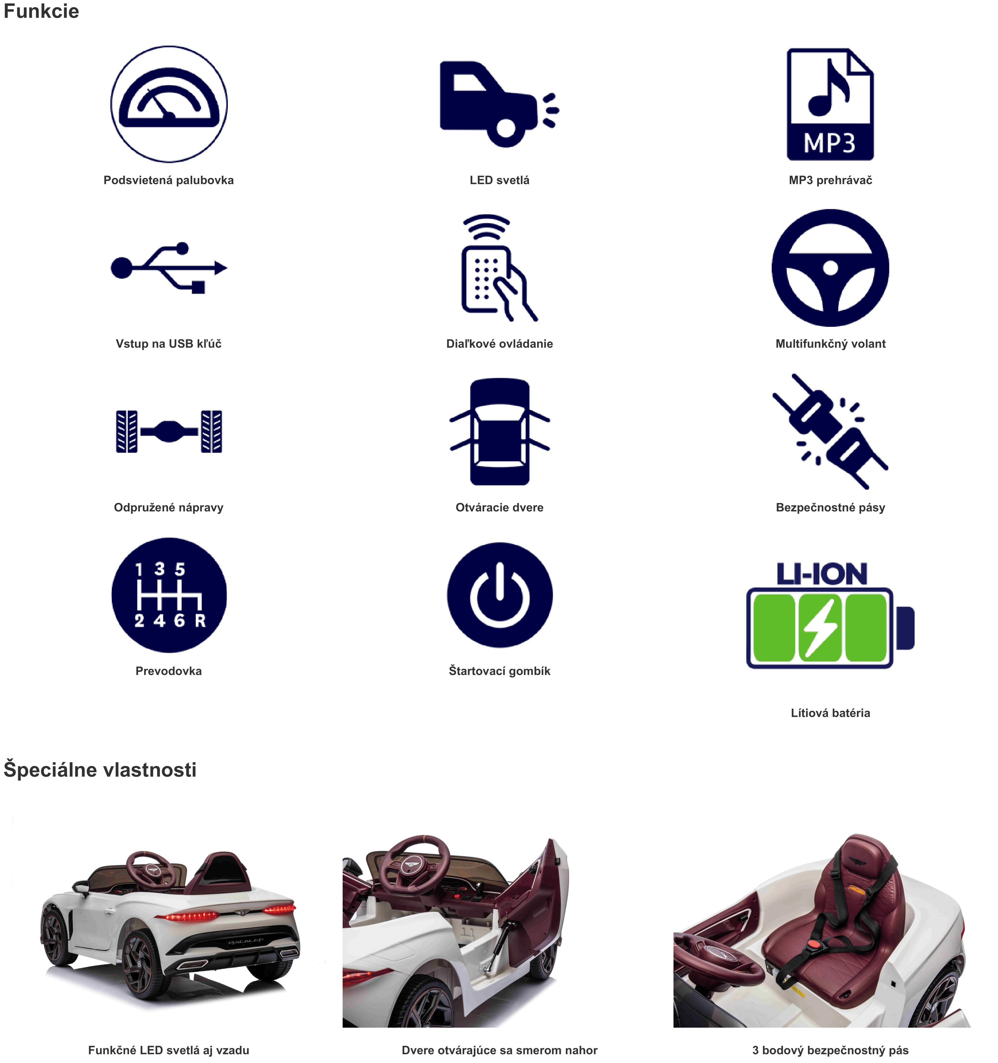 Popis produktu BENEO Bentley Bacalar 12V, biele, Dvere otvárajúce sa nahor, 2.4 GHz diaľkové ovládanie, LED svetlá,