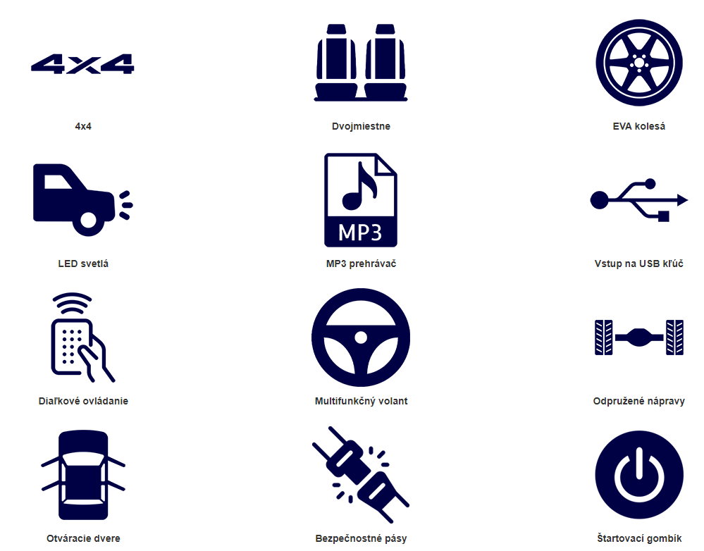 Otváracie dvere, zvukové efekty, indikátor stavu batérie, 3 rýchlosti vpred a 1 vzad, vďaka tejto výbave je vhodný aj pre jazdu v teréne .
