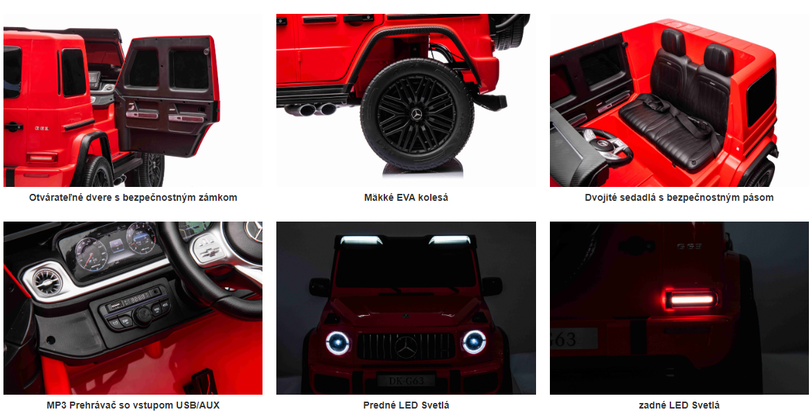 Autíčko Mercedes G63 s vyvýšeným podvozkom je najnovší modelový typ ozaj vhodný aj do terénu vďaka veľkým kolesám a nezávislému odpruženiu. Je vybavený MP3 prehrávačom so vstupom USB/AUX pre prehrávanie vlastných médií a zvukových efektov, multifunkčným volantom a pohodlnými sedadlami vhodné pre dve deti. Pohon zabezpečujú štyri 35W motory s batériou 12V/14Ah.