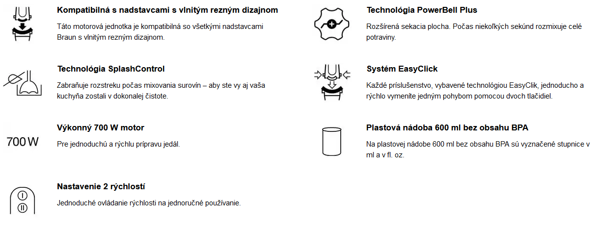 Nový MultiQuick 3 je vybavený dodatočnou frézovacou čepeľou POWERBell Plus pre väčšie rezanie na jednu rotáciu, aby ste dosiahli rýchlejšie a efektívnejšie výsledky mixovania. Ovládač duálnej rýchlosti je logický a jednoducho sa používa. Patentovaný systém EasyClick vám umožní jednoducho kliknúť a vychutnať si viac všestrannosti počas varenia. Dve tlačidlá, jeden pohyb na rýchlu a jednoduchú výmenu všetkých skvelých prvkov príslušenstva systému EasyClick.