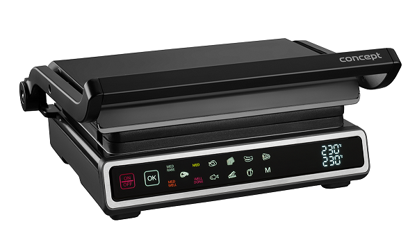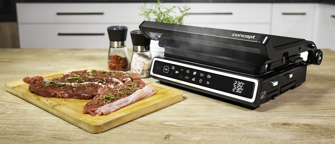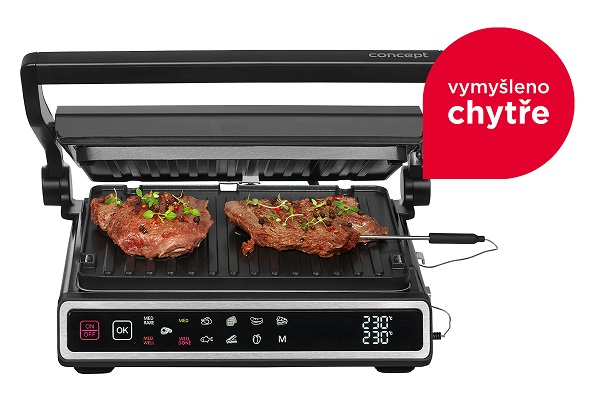 Nastavenie teploty pre každú dosku zvlášť umožňuje grilovanie rôznych druhov pokrmov naraz Šikovná funkcia SPLIT ZONE umožňuje nastavenie teploty pre každú dosku zvlášť alebo zahriatie len jednej dosky. Vďaka tomu zvládnete pripraviť rôzne druhy pokrmov a prispôsobiť si teplotu i čas dokončenia presne podľa potreby. Pohodlne prichystáte hlavný chod i prílohu naraz a hneď za tepla ich môžete rovno servírovať. Túto funkciu môžete využiť v manuálnom režime DIY, vďaka ktorému budete mať grilovanie plne vo svojich rukách. Gril si rozpálite presne tak, ako práve potrebujete a jednoducho ugrilujete čokoľvek, na čo si len spomeniete. Teplotná sonda postráži úroveň prepečenia mäsa Kontaktný gril Concept GE3550 je vybavený integrovanou teplotnou sondou. Oceníte ju predovšetkým pri grilovaní mäsa, počas ktorého vám postráži vnútornú teplotu a úroveň prepečenia. Stačí ju zapichnúť do pokrmu a strážiť vnútornú teplotu, ktorá sa vám zobrazí na displeji grilu. Teplotná sonda vám pomôže pripraviť mäso presne tak, ako ho máte radi a vaše grilovanie bude zase o krok ľahšie. Dokonalý steak pre každého Milujete steaky, ale nie vždy sa vám ich podarí pripraviť presne tak, ako ich máte radi? So šikovnou funkciou GRILL ASSISTANT budú za každým úplne perfektné. Stačí si len zvoliť stupeň prepečenia a gril sa o všetko postará. Vyberať môžete zo štyroch variant od krvavého až po dokonale prepečený. Gril si sám nastaví vhodnú teplotu a čas prípravy Kontaktný gril GE3550 ponúka jednoduché ovládanie pomocou 11 automatických programov vrátane manuálneho režimu DIY. Stačí vložiť suroviny, zvoliť správny program a gril si sám nastaví vhodnú teplotu a čas prípravy. Vychutnať si môžete dokonale prepečené steaky, slaninu, hydinu, ryby, zeleninu, sendviče alebo vafle. Nastavené hodnoty môžete sledovať na prehľadnom digitálnom displeji. BBQ grilovanie s extra veľkou grilovacou plochou Samozrejmosťou kontaktného grilu GE3550 je možnosť BBQ grilovania, ktoré umožňuje grilovanie na oboch platniach súčasne. Získate tak extra veľkú grilovaciu plochu, na ktorej pripravíte pokrmy pre celú rodinu alebo partiu priateľov. Gril si môžete prispôsobiť podľa potreby a využiť presne také platne, ktoré sa vám práve hodia - vrúbkované, hladké alebo ich vzájomne kombinovať. Grilovacie dosky s vrúbkovaným povrchom na prípravu steakov, hamburgerov alebo k zapekaniu Dosky s vrúbkovaným povrchom môžete využiť ako pre kontaktný (uzatvorený), tak aj pre BBQ (otvorený) spôsob grilovania. Uzatvorené grilovanie je vhodné na prípravu steakov, hamburgerov alebo k zapekaniu toastov, plnených tortíl alebo pannini. Ide o najrýchlejší spôsob prípravy, pretože sa potraviny rovnomerne opekajú z oboch strán naraz a nie je nutné ich obracať. Na otvorených doskách ugrilujete všetko, ako na klasickom grile. Vďaka vrúbkovanému povrchu sa potraviny dobre prepečú a zároveň si uchovajú svoju šťavnatú chuť. Prebytočná šťava a tuk sú drážkami odvedené do zbernej nádoby. Grilovacie dosky s hladkým povrchom sú ideálne na lievance, zemiakové placky, syry a k zapekaniu pečiva Grilovacie dosky s hladkým povrchom sú určené pre prípravu lievancov, palaciniek, vajec, rýb, zeleniny, syrov, zemiakových placiek alebo k zapekaniu pečiva. Dosky na vafle Kontaktný gril GE3550 si zamilujú aj vaše deti. Vďaka doskám na prípravu vaflí im môžete túto sladkú pochúťku urobiť kedykoľvek majú chuť. Príprava je rýchla, jednoduchá a podstatne lacnejšia, ako keď navštívite cukráreň. A čo je najlepšie? Doma si ich urobíte presne podľa svojej chuti. Na sladko, na slano, na raňajky, desiatu alebo len tak, keď máte chuť. Zdravšie grilovanie bez oleja a ľahká údržba Kontaktný gril GE3550 je osadený kvalitnými hliníkovými doskami, ktoré rozvádzajú teplo po celej svojej ploche. Povrch dosiek je nepriľnavý, takže sa pokrmy nepripaľujú. Grilovanie je teda zdravšie, pretože nevyžaduje použitie žiadneho tuku alebo oleja. Zároveň sa dosky veľmi dobre čistia. Po vychladnutí stačí usadené nečistoty odstrániť pomocou špeciálnej škrabky alebo utrieť vlhkou handrou. Následne môžete dosky vybrať a spoločne so zbernou nádobou na zachytávanie šťavy vložiť do umývačky riadu. Nezaberie príliš miesta Veľkou výhodou je možnosť uzamknutia grilu v uzavretej polohe. Vďaka tomu vám v kuchyni nezaberie toľko miesta a ľahšie ho uskladníte, pokiaľ ho práve nevyužívate. Menu na celý deň Kontaktný gril Concept GE3550 využijete po celý deň. Ráno vám prevonia deň sladkými raňajkami v podobe lievancov, palaciniek alebo vaflí, na obed vám pripraví ten najlepší steak a večer pohostí vás aj vašich najbližších grilovanými pochúťkami všetkého druhu.
