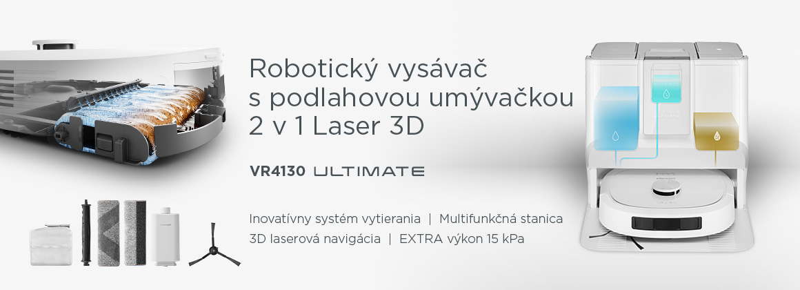 Robotický vysávač a podlahová umývačka 2 v 1 Laser 3D Aqua ULTIMATE Concept VR4130 predstavuje jedinečné spojenie robotického vysávača a podlahovej umývačky. Kombinuje účinné vysávanie a precízne vytieranie, takže podlahy budú nielen zbavené prachu, ale i skutočne čisté. Vďaka vysokému saciemu výkonu 15 kPa a pokročilé 3D laserovej navigácii si poradí i v členitom priestore a vyhne sa i malým prekážkam. Vďaka veľkým kolieskam a silnému motoru prekoná prahy dverí a iné prekážky do výšky až 2 cm. Jeho kľúčovou výhodou je úplná samostatnosť - multifunkčná stanica zvládne kompletnú údržbu, od vyprázdnenia prachového zásobníka až po dôkladné vyčistenie mopu. Stačí vysávač uviesť do prevádzky a o zvyšok sa postará sám.