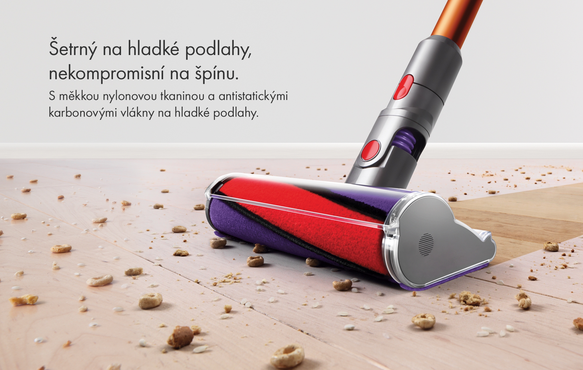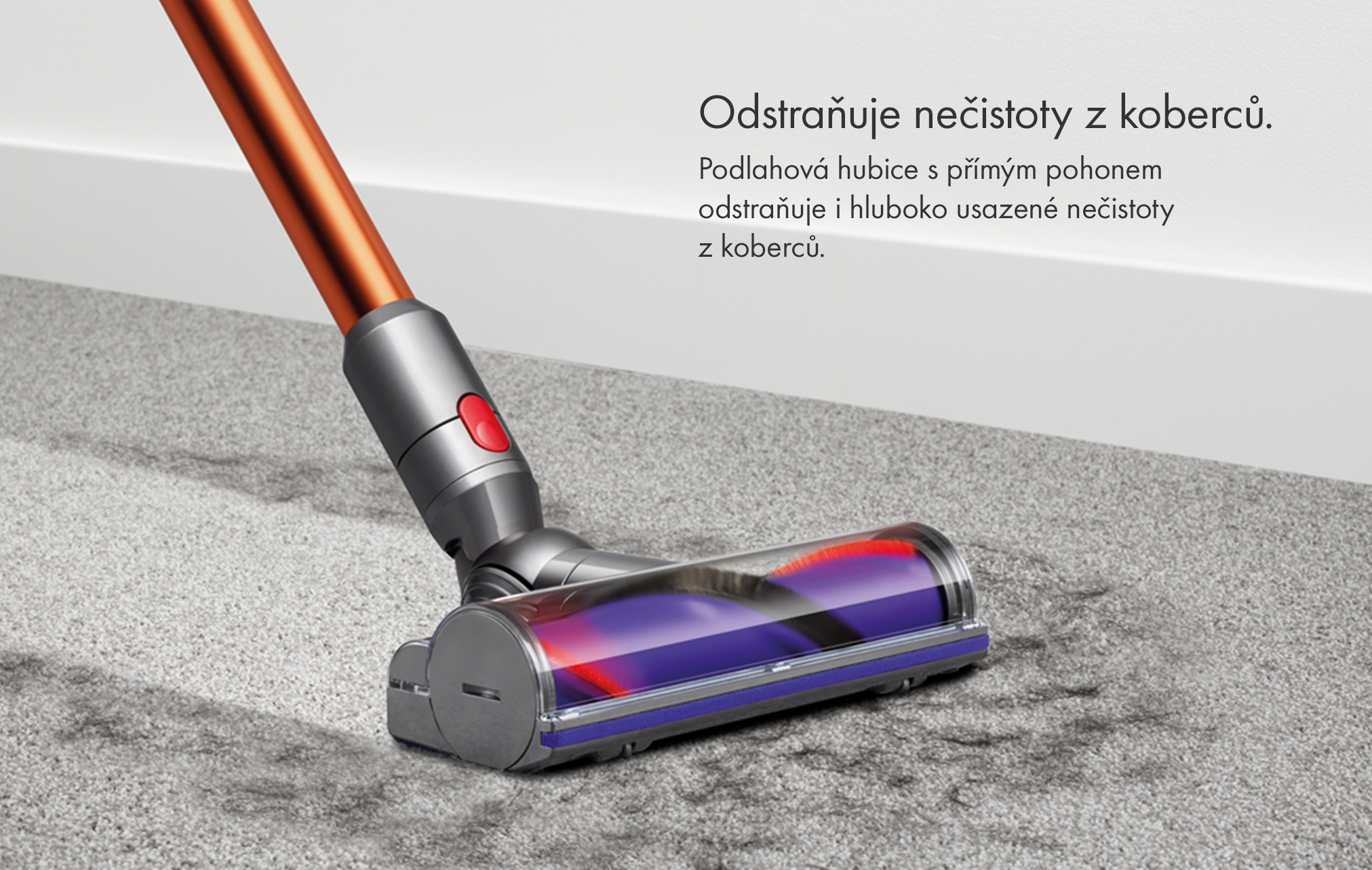 Priamo poháňaná rotačná kefa tlačí štetiny hlboko do koberca a tak odstraňuje aj hlboko usadené nečistoty. Výkon tejto rotačnej kefy je o 150% vyšší ako má kefa vysávača Dyson V6.