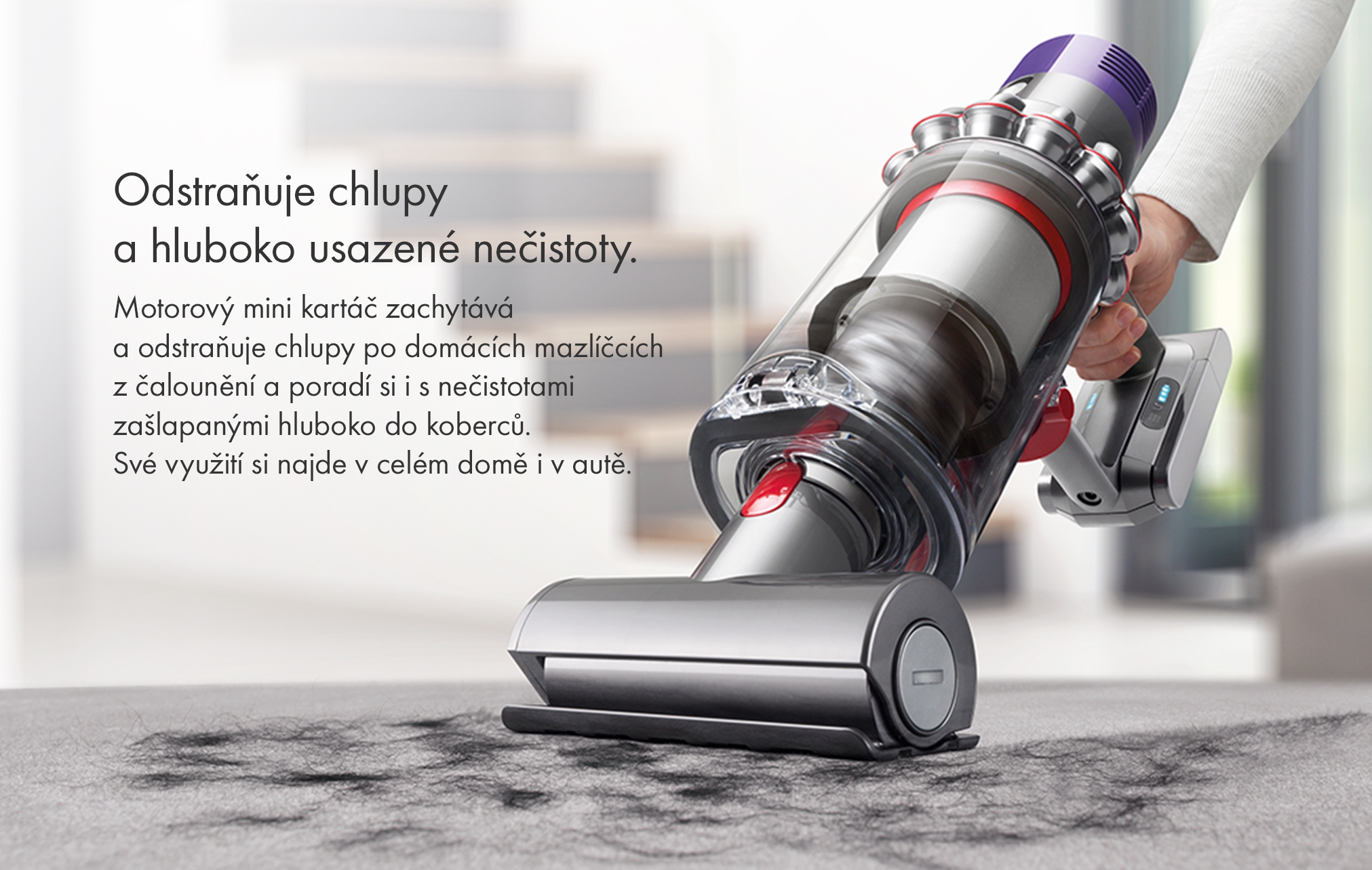 Mini hubica s motorovou rotačnou kefou vytiahne a odstráni zvieracie chlpy z čalúneného nábytku alebo autosedačiek a vysaje hlboko usadené nečistoty z kobercov.