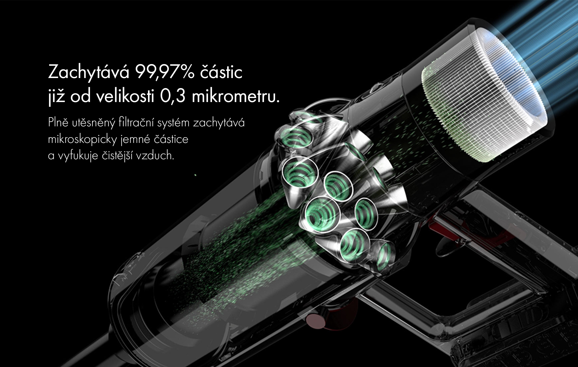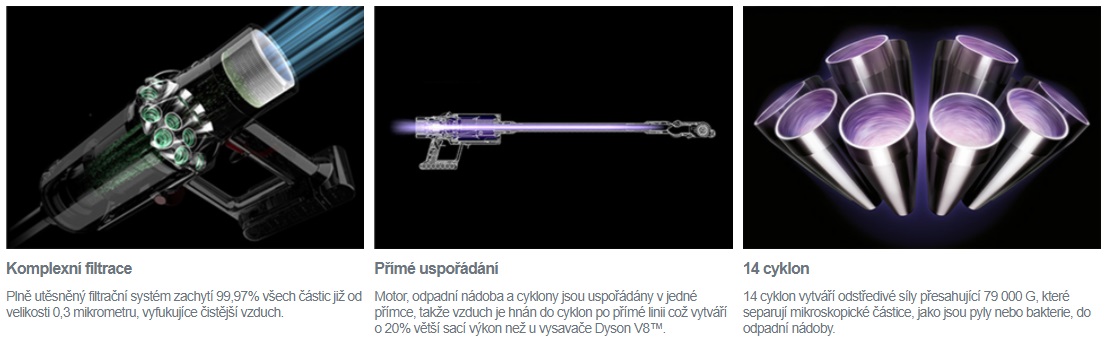 Vďaka vzduchotesnému prevedeniu bloku cyklón a tlakovému gumovému tesneniu okolo zdokonaleného filtra je celý systém naprosto vzduchotesný – to bráni úniku prachu, alergénov a baktérií späť do okolitého ovzdušia. Vysávač tak zachytáva 99,97% prachových častíc už od veľkosti 0,3 mikrometru a vypúšťa vzduch, ktorý je čistejší ako ten, ktorý dýchate. Filtre pred a za motorom sú za účelom jednoduchšej údržby integrované do jednej spoločnej jednotky.