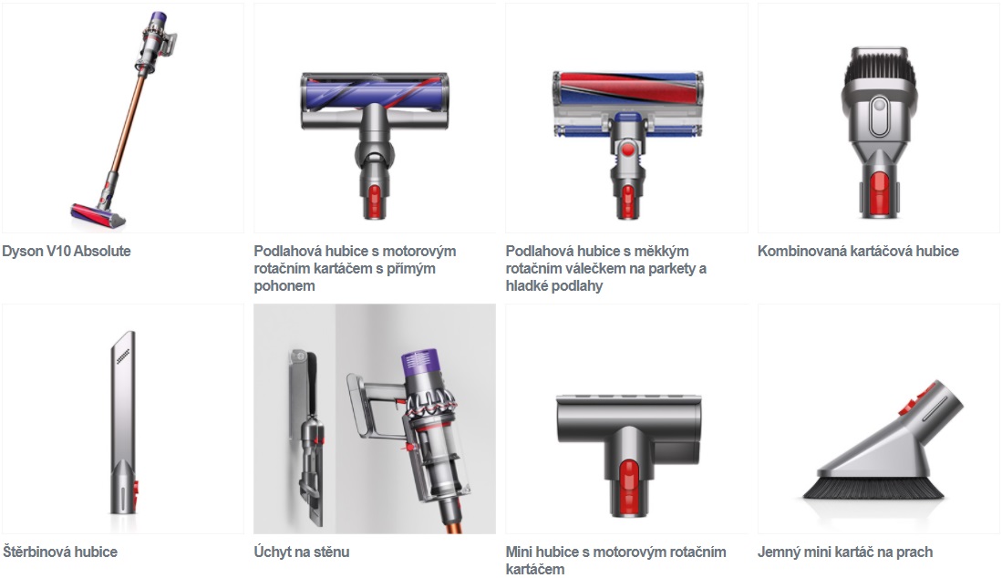 Obsah dodávky Vysávač V10 Trubica Podlahová hubica s motorovou rotačnou kefou s priamym pohonom Podlahová hubica s mäkkým rotačným valčekom na parkety a hladké podlahy Mini hubica s motorovou rotačnou kefou Jemná mini kefa na prach Kombinovaná kefová hubica Štrbinová hubica Li-Iontový akumulátor s nikel-kobalt-hliníkovou katódou (pevnou súčasťou tela vysávača) Nabíjací adaptér Úchyt na stenu Filtračná jednotka (inštalovaná vo vysávači) |
