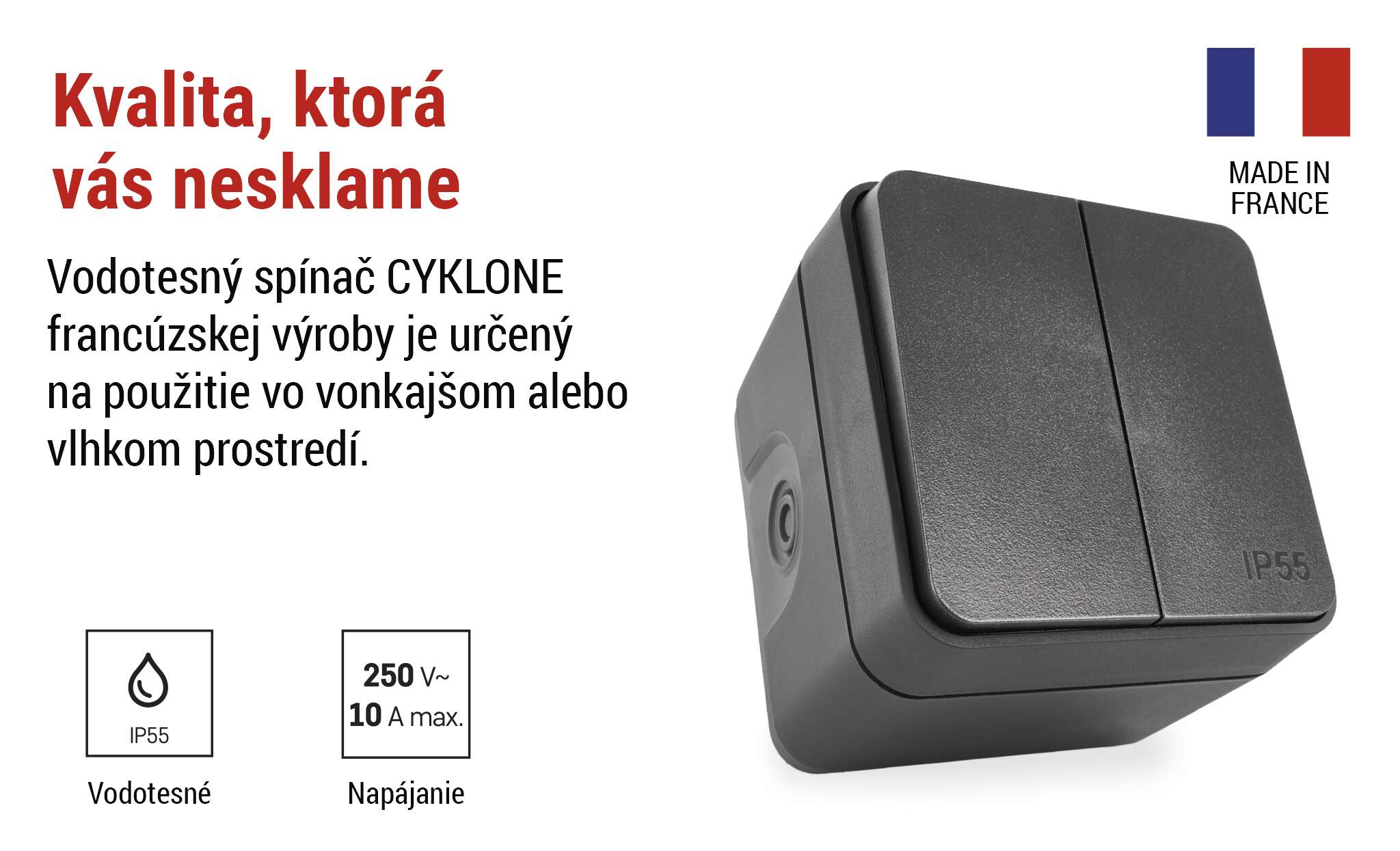 Objavte naše vysoko kvalitné vonkajšie nástenné vypínače zo série CYKLONE – ideálne riešenie pre bezpečné a pohodlné ovládanie elektrických zariadení na terasách, v záhradách a na balkónoch. Vďaka svojej vysokej odolnosti voči poveternostným vplyvom a modernému, elegantnému dizajnu umožňujú jednoduché a štýlové ovládanie vonkajšieho osvetlenia, techniky a dekorácií za každého počasia.