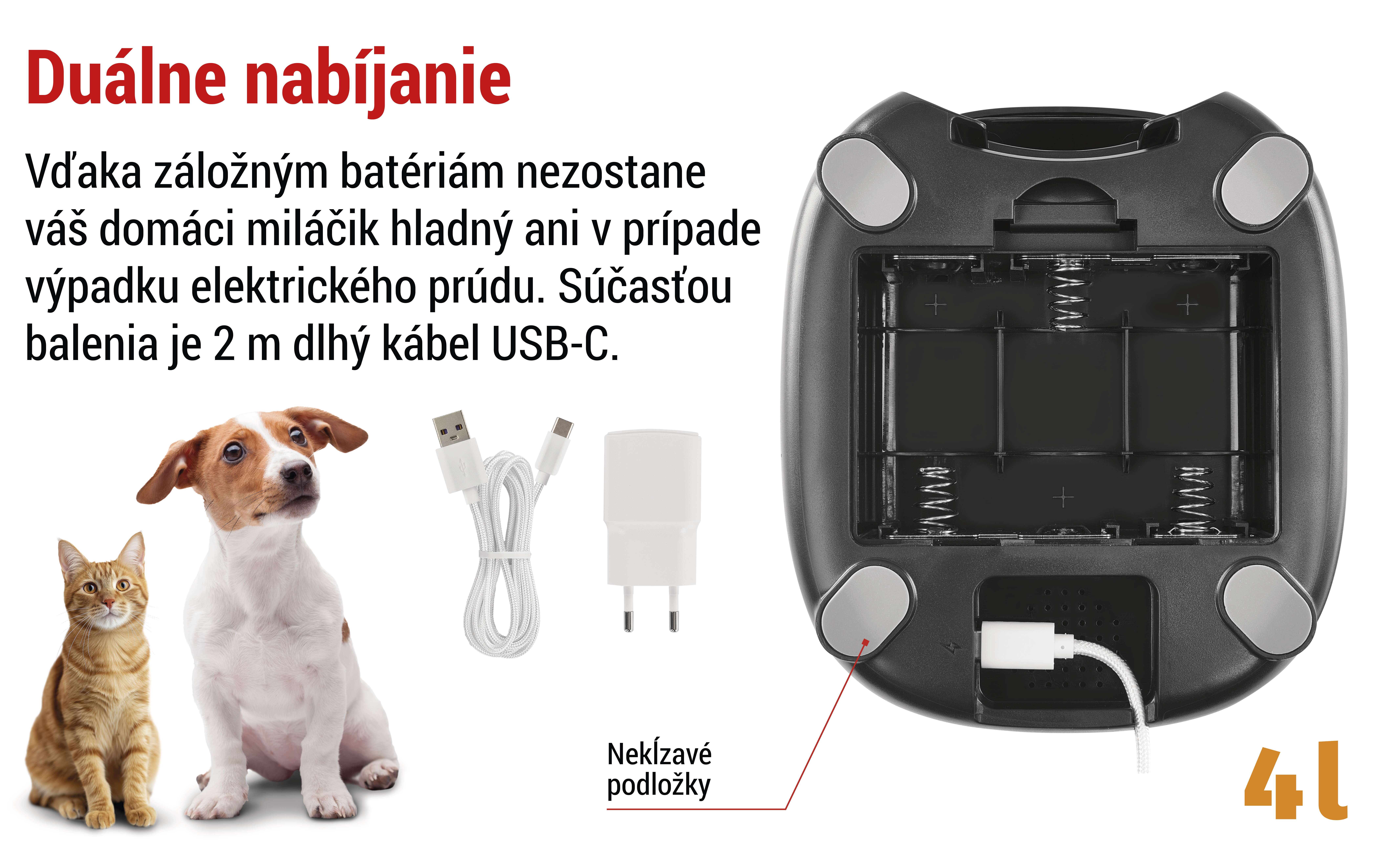 Napájanie zabezpečuje 2 m dlhý kábel USB-C s napájaním. Vďaka záložným batériám, ktoré nie sú súčasťou balenia, sa nemusíte obávať o kŕmenie svojho domáceho maznáčika ani v prípade výpadku elektrického prúdu. Okrem toho vás optický signál upozorní, keď je potrebné vymeniť batérie.