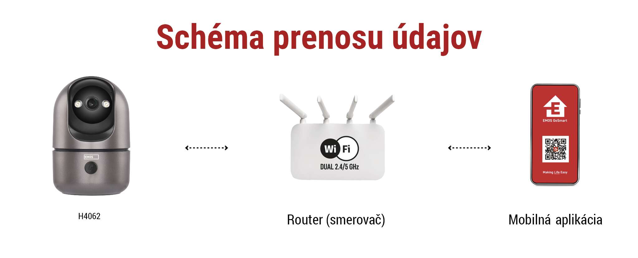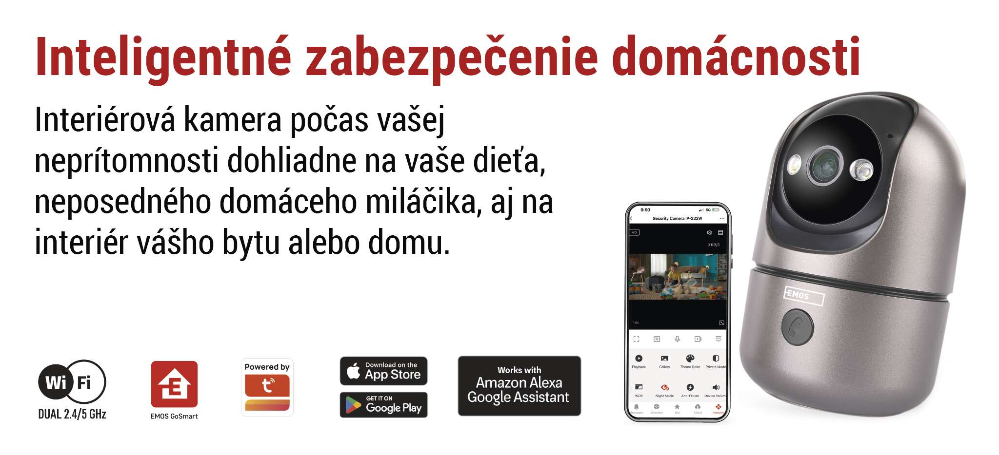 Keďže kamera je vybavená technológiou Wi-Fi s funkciou dual band (2,4 a 5 GHz), stačí ju pripojiť k vašej Wi-Fi sieti a spárovať s mobilnou aplikáciou EMOS GoSmart, ktorá je k dispozícii pre Android a iOS. To vám umožní monitorovať váš domov, kanceláriu alebo obchodné priestory na vašom mobilnom zariadení kedykoľvek a kdekoľvek. Okrem toho je plne kompatibilná s hlasovými asistentmi Google Assistant a Amazon Alexa.