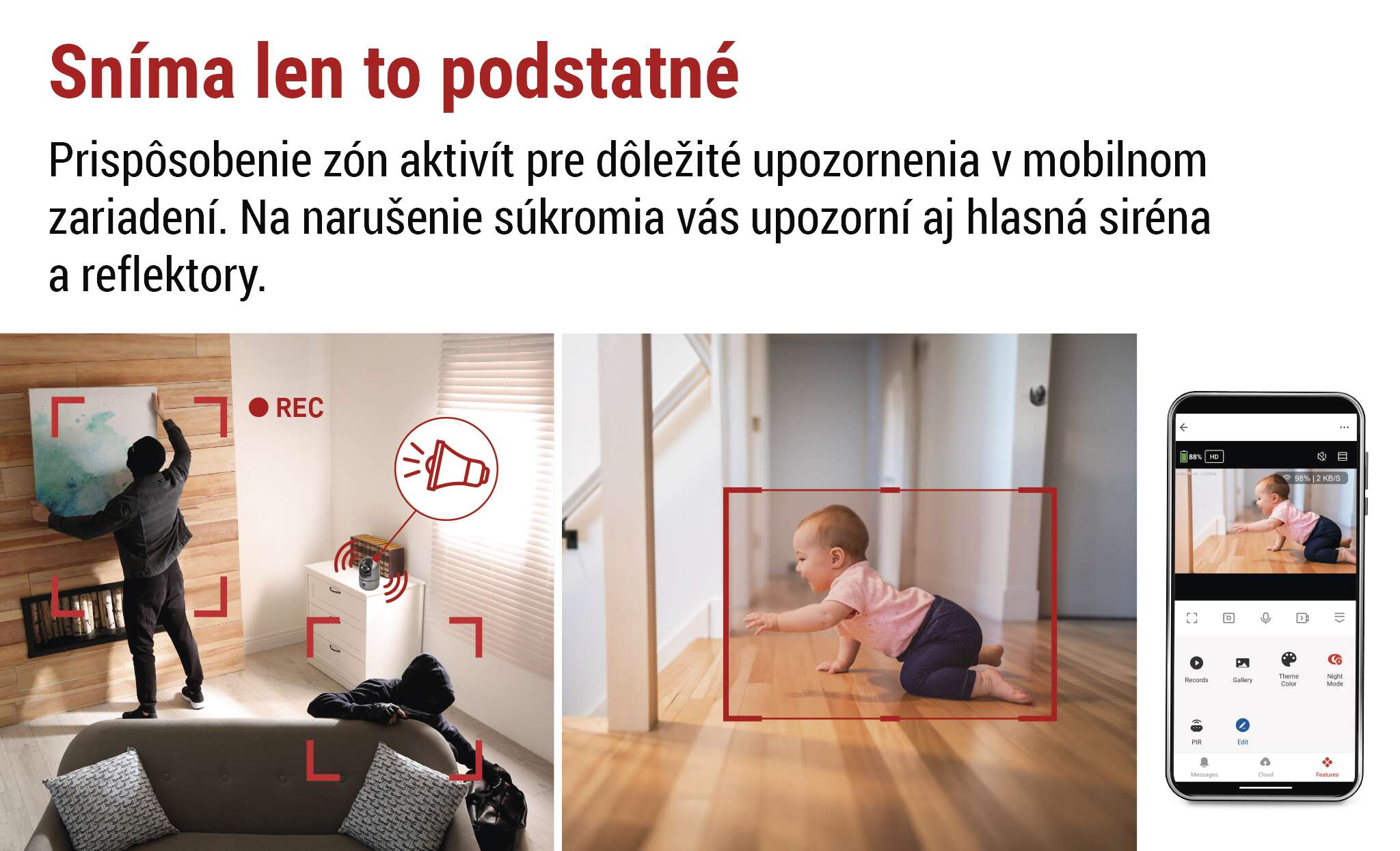 Môžete vybrať až 4 prednastavené monitorovacie body. Mobilné upozornenia vás potom okamžite upozornia na to, čo sa deje doma – nech ste kdekoľvek. Záznam sa ukladá na SD kartu alebo do cloudu, takže nestratíte žiadne dôležité videá.