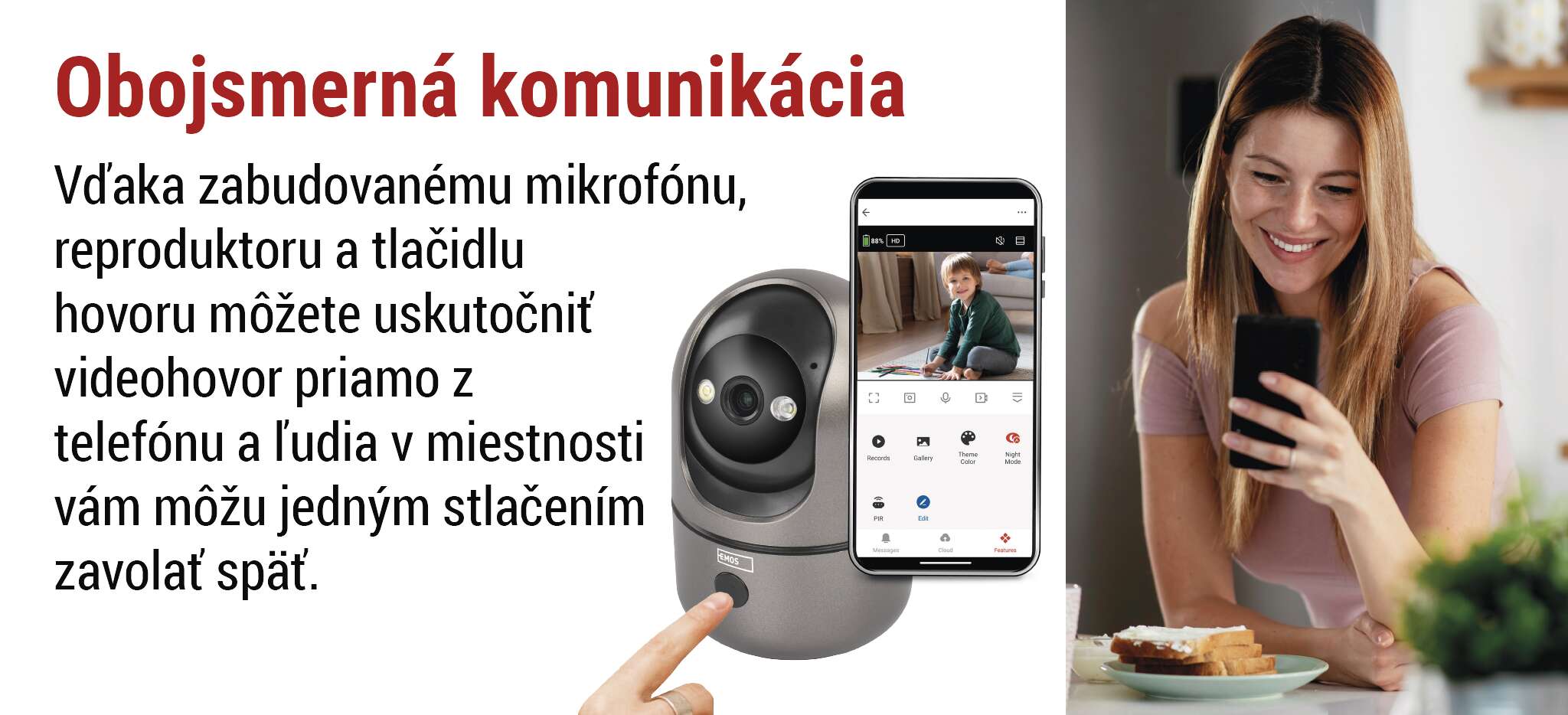 Zažite novú úroveň bezpečnosti a pohodlia vďaka pokročilej obojsmernej komunikácii a jedinečnému tlačidlu okamžitého volania. Kamera vám nielen umožňuje jasne počuť, čo sa deje vo vašom okolí, ale aj okamžite reagovať – či už upokojujúcim slovom, varovaním alebo krátkym rozhovorom s návštevníkom. Vďaka integrovanému tlačidlu volania môže ktokoľvek pri kamere iniciovať hovor s vami jediným stlačením. Ideálne riešenie pre deti, seniorov alebo kohokoľvek, kto potrebuje rýchlo upútať vašu pozornosť bez telefónu. Táto funkcia posúva inteligentnú kameru na vyššiu úroveň, čím sa stáva nielen strážcom bezpečnosti vášho domova, ale aj praktickým komunikačným nástrojom, ktorý máte vždy po ruke.