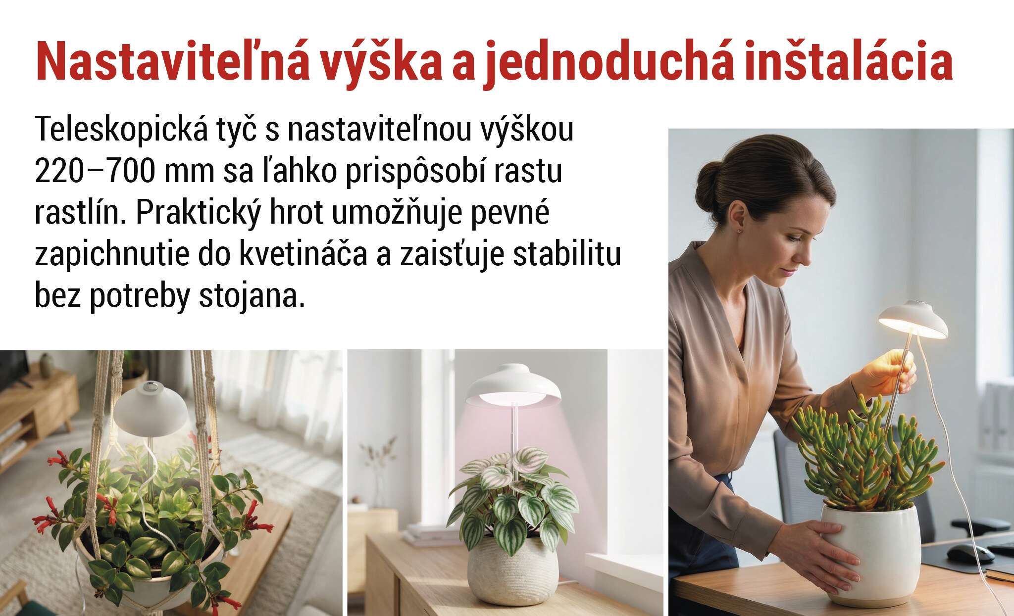 Toto pestovateľské osvetlenie môžete umiestniť prakticky kdekoľvek, kde rastlinám chýba prirodzené denné svetlo. Je ideálne do obývačiek, spální, pracovní, kancelárií a kuchýň – napríklad na pracovnú dosku, poličku alebo parapet. Je tiež ideálna do miestností orientovaných na sever, tmavších kútov interiéru, bytov bez balkóna alebo priestorov, kde rastliny nemajú prístup k slnečnému žiareniu počas celého dňa. Vďaka kompaktnej veľkosti a nenápadnému dizajnu slúži aj ako štýlový interiérový doplnok.