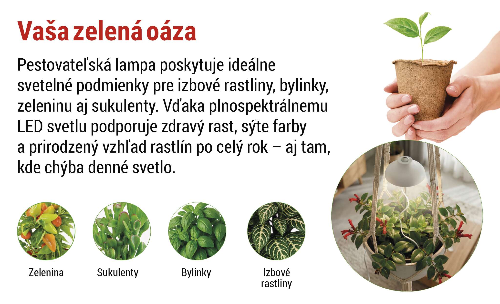 Svetlo pre zdravý rast rastlín. LED rastlinné osvetlenie Z7901 je kompaktné, elegantné a technicky sofistikované riešenie na podporu rastu izbových rastlín, byliniek a sukulentov v domácom prostredí. Vďaka kombinácii bieleho a červeného LED svetla s plným spektrom poskytuje rastlinám presne to spektrum, ktoré potrebujú na fotosyntézu, silnú tvorbu koreňov, zdravý rast listov a bohaté kvitnutie.