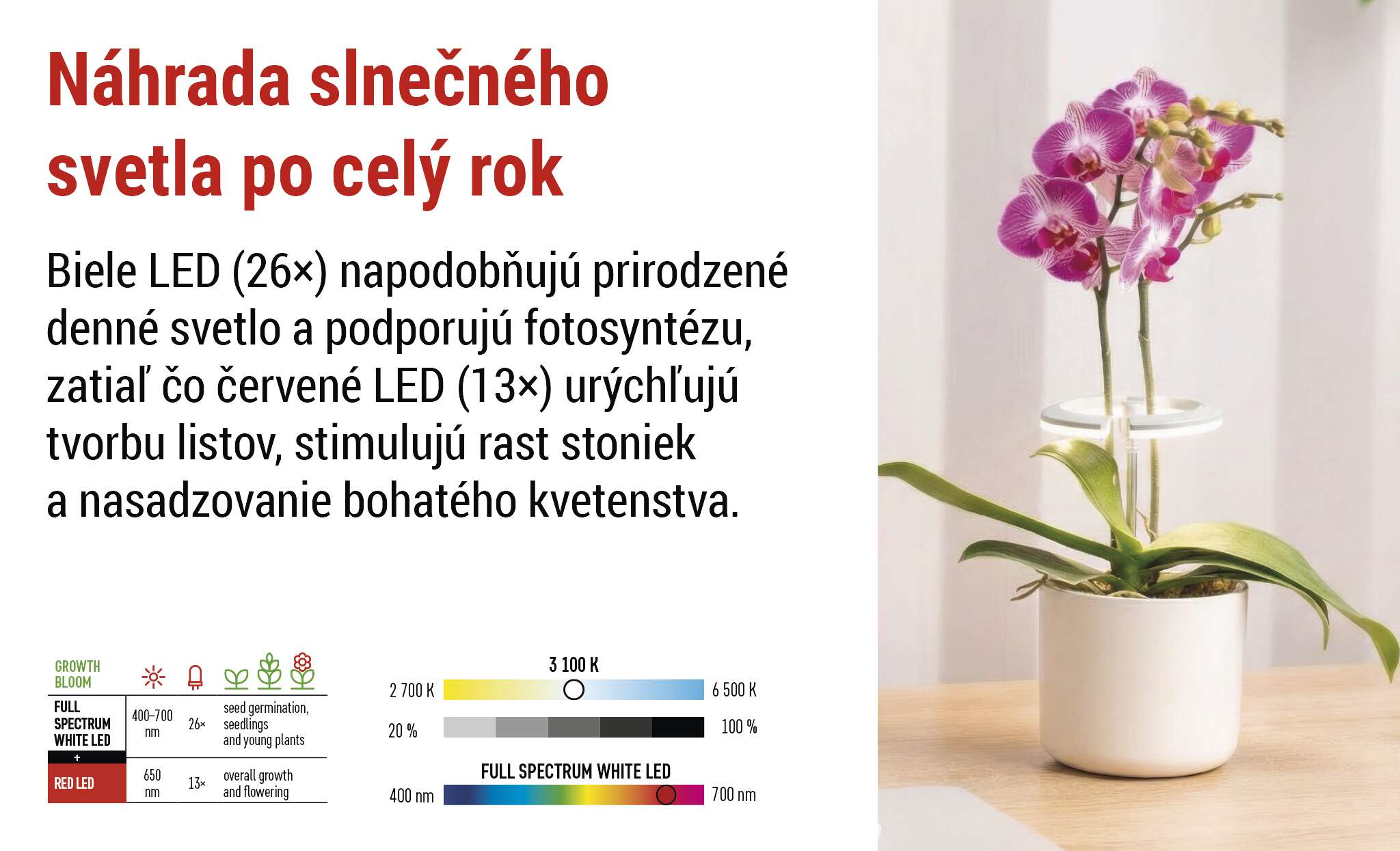 vetlo s plným spektrom, ktoré skutočne prospieva rastlinám. Lampa využíva 26 bielych LED diód a 13 červených LED diód, ktoré spolu pokrývajú celé spektrum potrebné pre fotosyntézu: