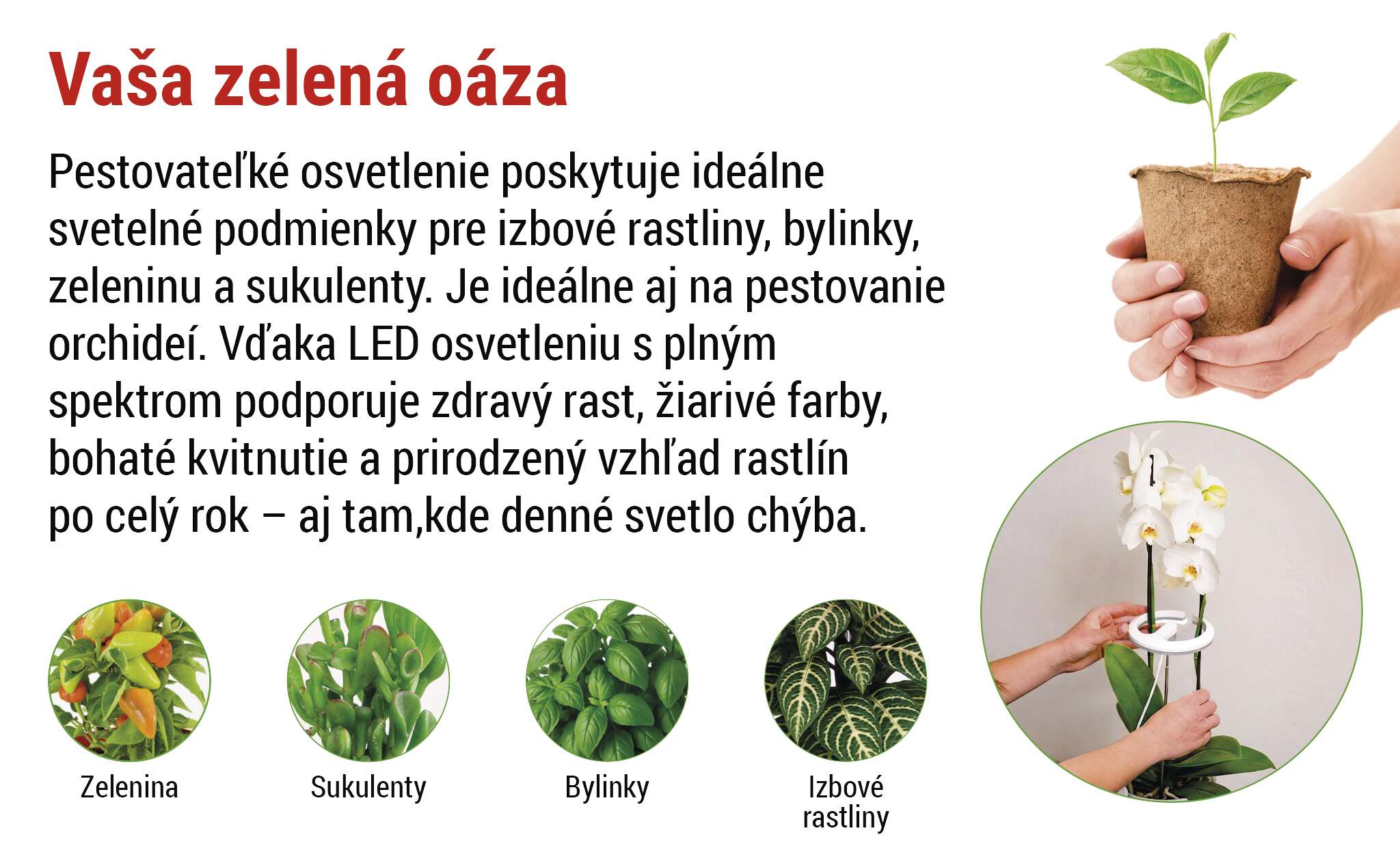 - Červené LED diódy stimulujú produkciu chlorofylu, podporujú rast stoniek a výrazne prispievajú k bohatému kvitnutiu.