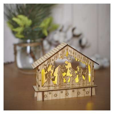 Atmosféru tradičných Vianoc plnú vône perníkov, zvukov vianočných kolied a nezameniteľnej chuti zemiakového šalátu môžete vytvoriť pomocou drevených dekorácií. Vianočný betlehem vyrobený z dreva je osvetlený teplým bielym svetlom, ktoré vytvára príjemnú atmosféru. Napája sa pomocou 2× batérií AAA, vďaka čomu môžete túto dekoráciu umiestniť kdekoľvek vo vašom interiéri. Je obzvlášť skvelá na okenný parapet, komodu alebo TV stolík.