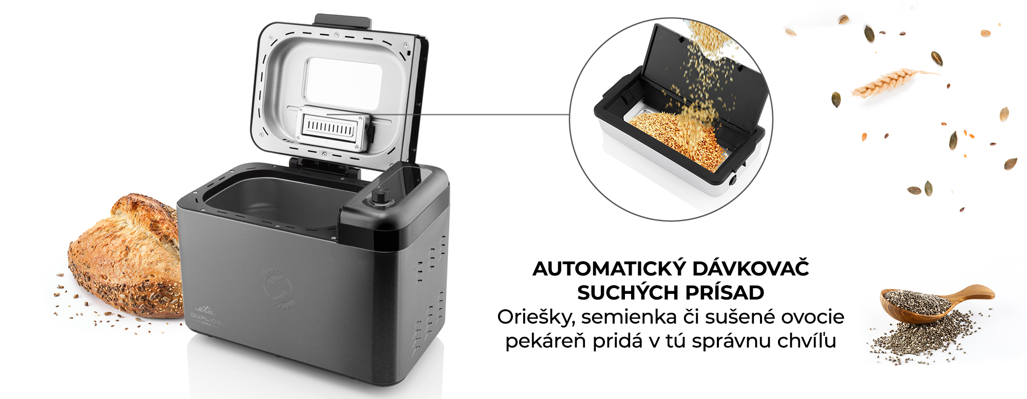 Na domácu pekáreň ETA Duplica II MAX sa môžete plne spoľahnúť. Automaticky pridá suché prísady ako oriešky, semienka či sušené ovocie presne v tú pravú chvíľu – vy sa tak nemusíte o nič starať. Navyše nedochádza u prísad k nadmernému spracovávaniu alebo rozdrveniu.