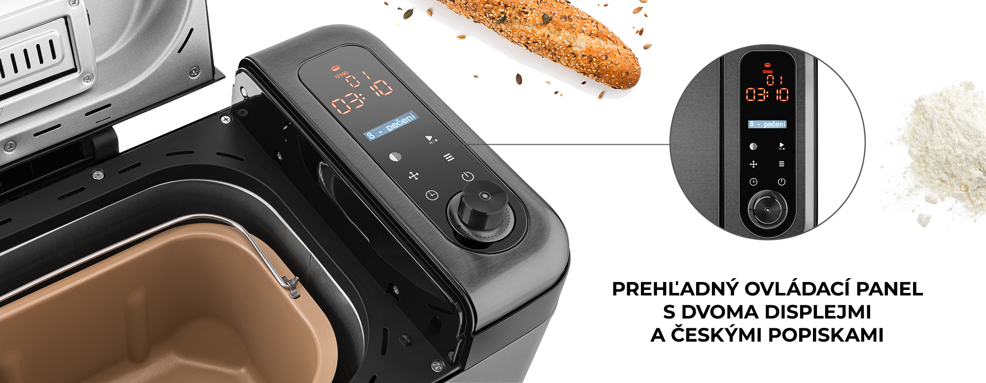 Vďaka dotykovému ovládaciemu panelu s dvomi displejmi je nastavenie domácej pekárne hračka. Všetky programy sú navyše popísané v češtine, s pekárňou si tak budete rozumieť.
