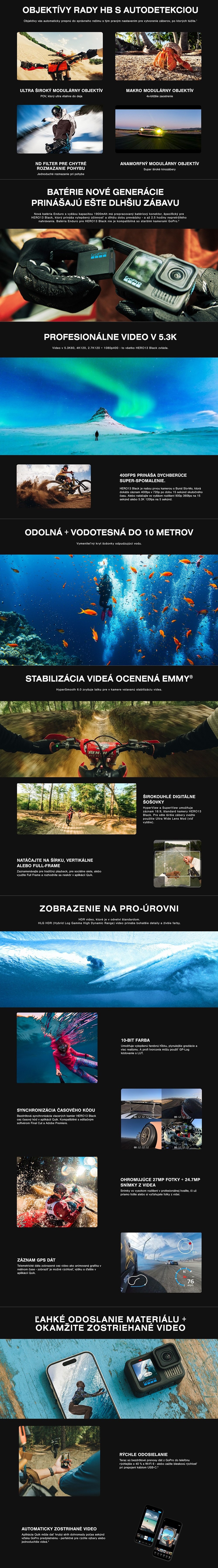 Záznamové médium pre video: Pamäťová karta • Podporované pamäťové karty: microSD karta • Rozlíšenie fotoaparátu: 27 Mpx • Stabilizácia obrazu: HyperSmooth 6.0 • Veľkosť displeja: 2.27" • Dotykový displej: áno • Záznam v kvalite: full HD, 4K, 2,7K, 5,3K • Wi-Fi: Áno
