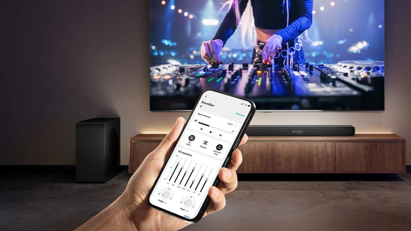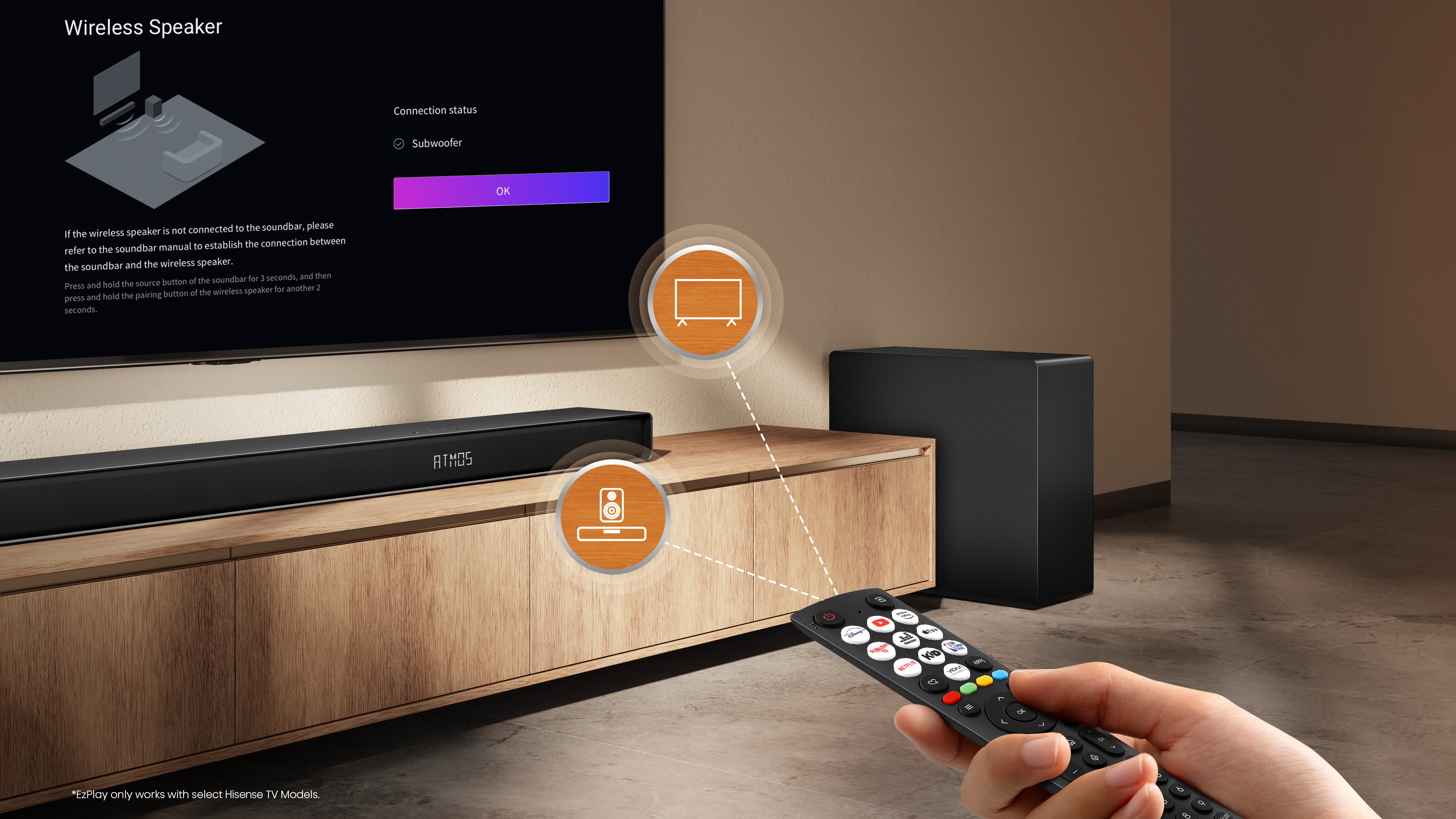 Ovládajte zvukové režimy svojho soundbaru Hisense priamo cez diaľkový ovládač televízora a optimalizujte tak zvuk aj dialógy. Vďaka technológii EzPlay 3.0 sa na obrazovke zobrazí aktuálny stav bezdrôtových reproduktorov v reálnom čase. Funkcia EzPlay je dostupná iba pri vybraných modeloch televízorov Hisense.