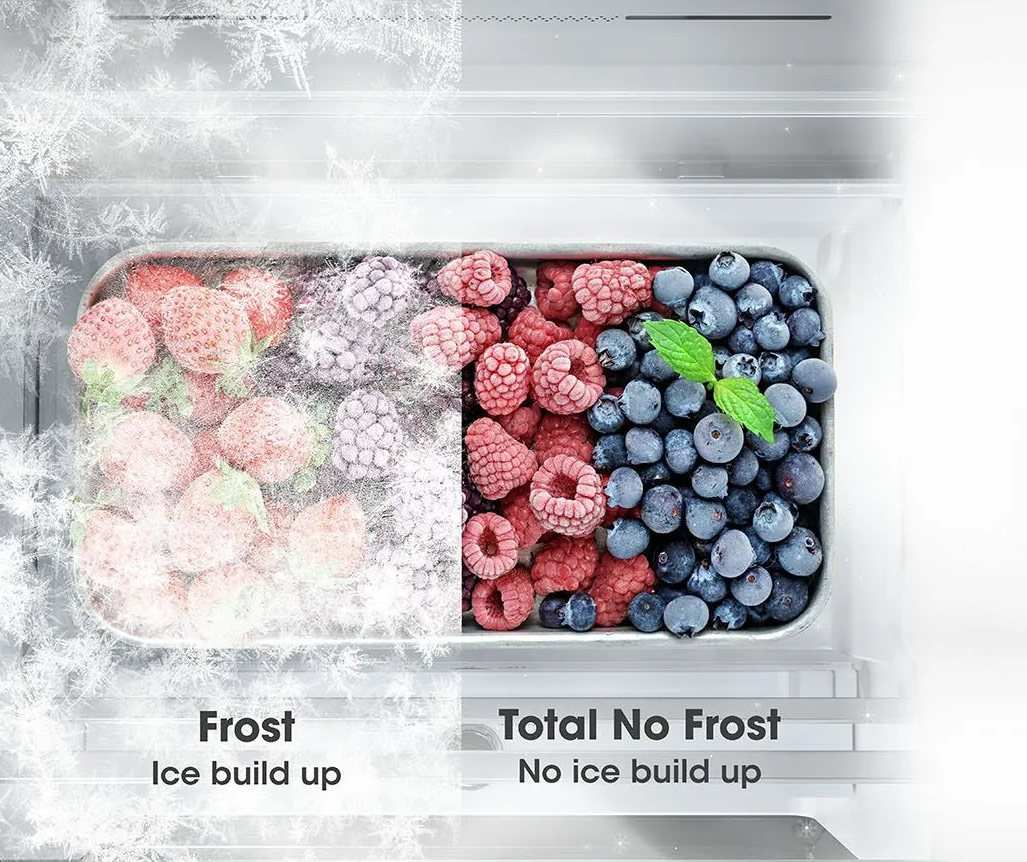 Technológia Total NoFrost predstavuje jedinečný chladiaci systém nainštalovaný priamo v mraziacom oddiele. Zabraňuje tvorbe ľadu a námrazy, vďaka čomu sa vyhnete zdĺhavému procesu odmrazovania. Výhodou je nízka spotreba energie pri zachovaní výkonu a správneho chodu chladničky. Cirkulácia ionizovaného vzduchu zabraňuje strate vlhkosti a udržuje v potravinách všetky vitamíny a minerály prospešné pre telo.