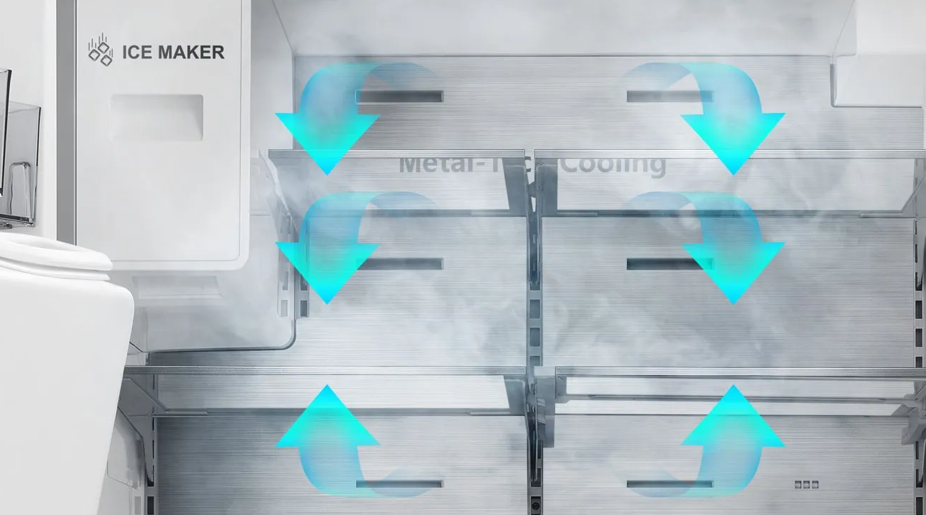 Zadná stena chladničky je pokrytá nerezovou oceľou, ktorá umožňuje rovnomerné rozptýlenie studeného vzduchu. Táto kombinácia pokročilých technológií zabezpečuje optimálnu úroveň teploty a vlhkosti.