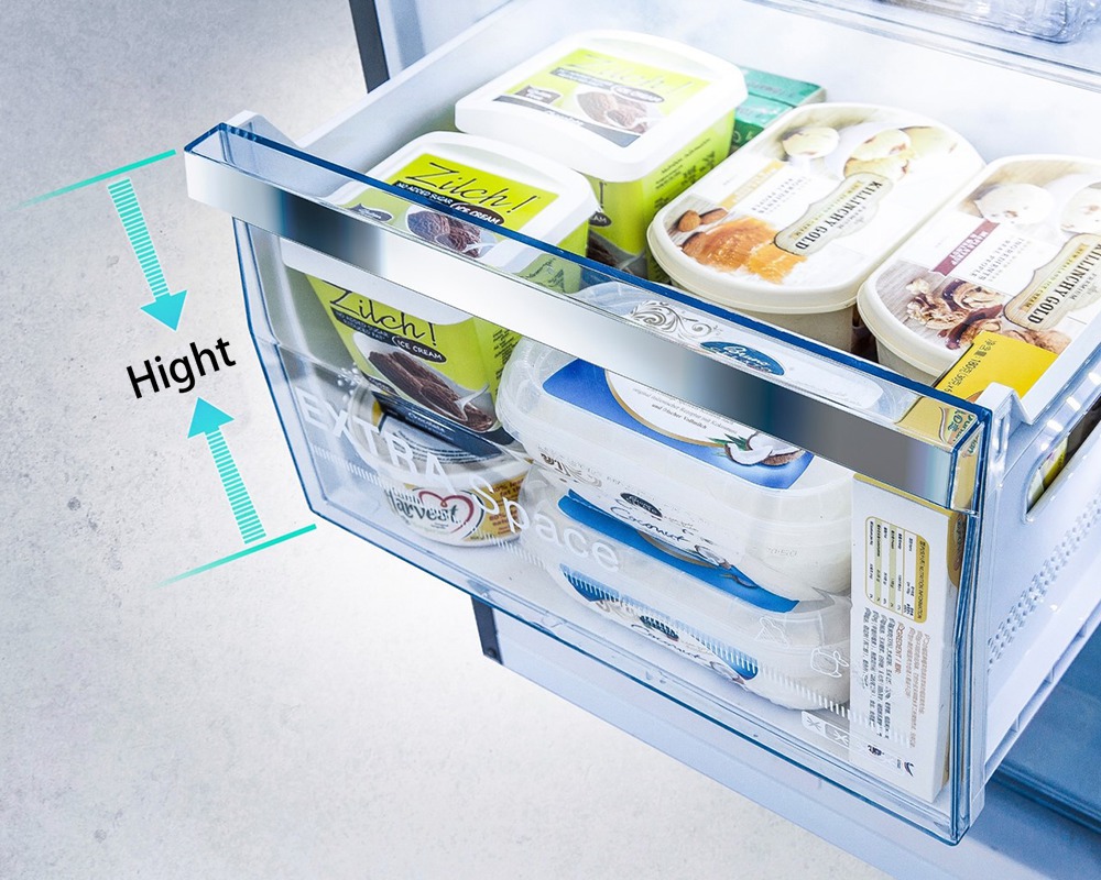 Priestranný priestor chladničky umožňuje usporiadať obsah chladničky tak, aby ste mali všetko na očiach. Pohodlne sa do nej zmestí veľký nákup pre celú rodinu a potraviny budú voľne dýchať. Mraznička vďaka svojmu nadštandardnému objemu pojme nielen mrazené výrobky a potraviny z obchodu, ale umožní vám aj dlhodobé skladovanie doma pripravených jedál, polievok, detskej výživy alebo smoothies.
