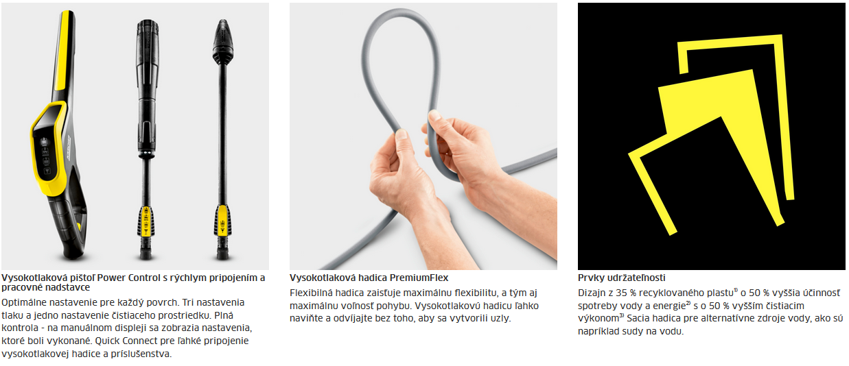 Vysokotlakový čistič, ktorý ide ešte o krok ďalej – limitovaná edícia čierneho K 4 Power Control Go!Further, vyrobený z 35 percent recyklovaného plastu¹⁾ s exkluzívnym príslušenstvom, ponúka najlepšie výsledky čistenia a vysoký komfort. A vďaka aplikácii Kärcher Home & Garden je nájdenie správneho tlaku tiež veľmi jednoduché. Poradca pri použití integrovaný v aplikácii podporuje používateľov praktickými tipmi pre každú čistiacu situáciu a čistiacu úlohu – pre dokonalé výsledky čistenia. Pre maximálnu kontrolu je možné úroveň tlaku jednoducho nastaviť otočením pracovného nadstavca alebo skontrolovať na pištoli G 160 Q Power Control. K 4 Power Control Flex tiež presvedčí systémom čistiaceho prostriedku Kärcher Plug 'n' Clean pre jednoduchú výmenu čistiaceho prostriedku, vysokotlakovou hadicou PremiumFlex pre väčšie pohodlie, teleskopickou rukoväťou pre jednoduchú prepravu, systémom Quick Connect pre úsporu času a námahy pri zacvakávaní a vyberaní vysokotlakovej hadice zo zariadenia, ako aj pištoľou a parkovacou polohou pre ľahký prístup k príslušenstvu za každých okolností.