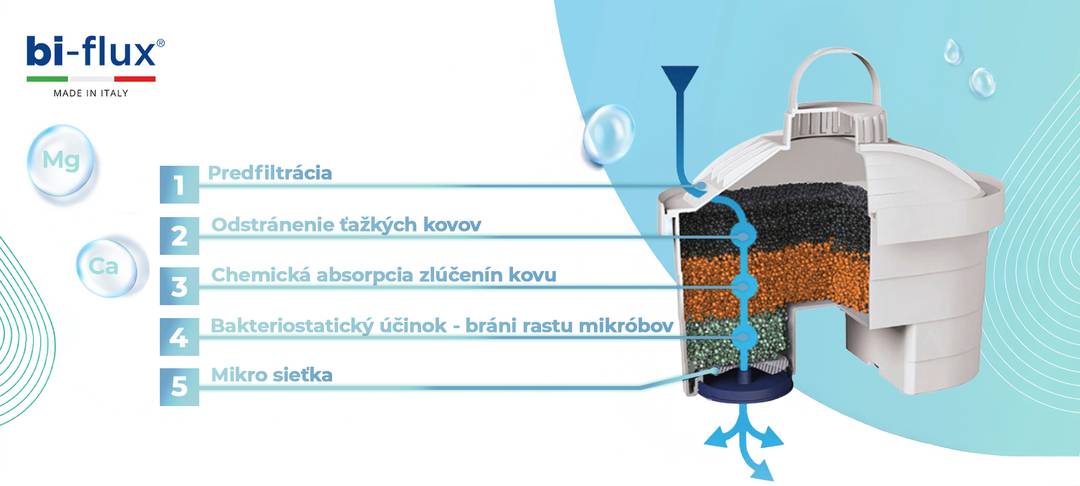 Filtre na vodu Bi-flux® Universal udržujú vo vode cenné minerálne soli, ktoré sú nevyhnutné pre správne fungovanie ľudského tela a podporu celkového zdravia. Kohútiková voda je prirodzeným zdrojom týchto minerálov najmä vápnika, horčíka a draslíka, ktoré zohrávajú kľúčovú úlohu v životne dôležitých funkciách organizmu: