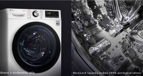 Inteligentná práčka má odolné a elegantne pôsobiace dvierka vyrobené z tvrdeného skla. Bubon práčky je vybavený hygienickými nerezovými lopatkami, ktoré eliminujú baktérie o 99 %. Prehľadný dotykový diplej je veľmi dobre čitateľný a navyše je v českom jazyku. Dopĺňa ho elegentný kovový otočný volič programov.