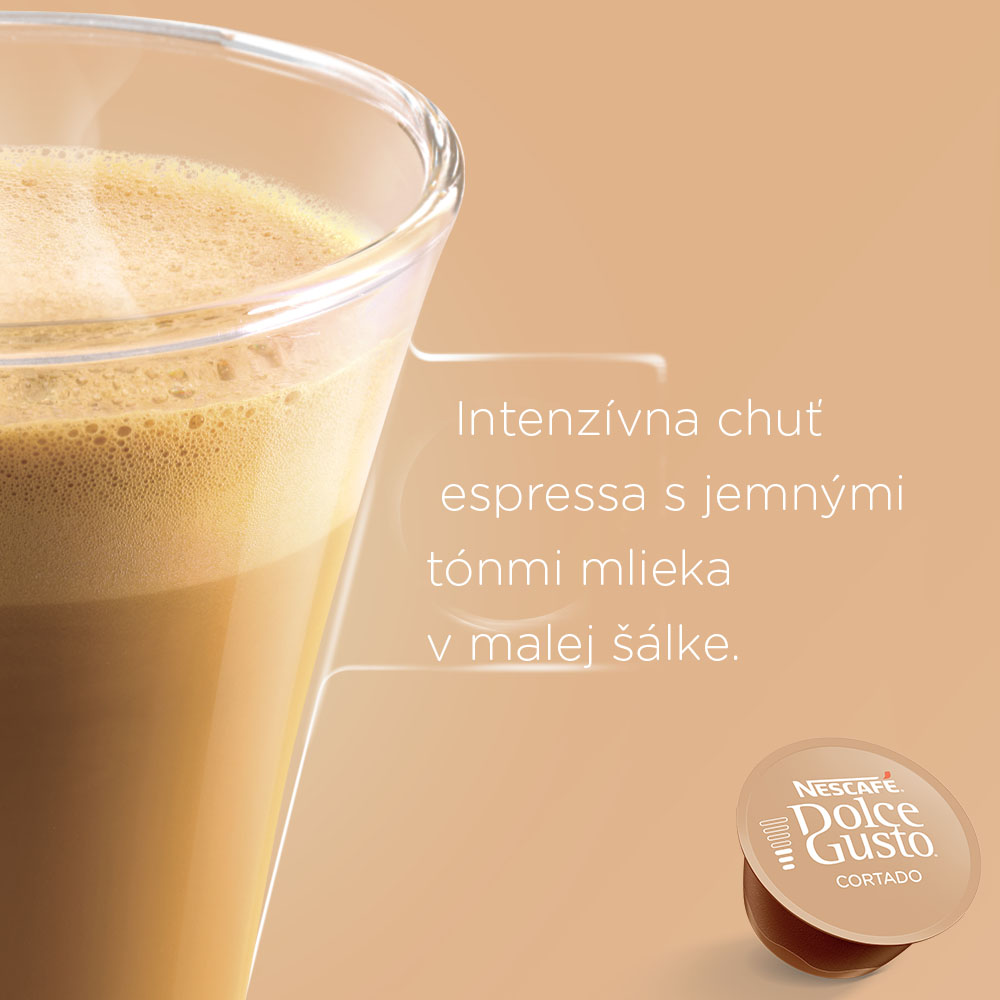 Objavte silné NESCAFÉ® Dolce Gusto® Cortado inšpirované španielskou kávovú kultúrou. Je podobné talianske káve espresso macchiato, avšak zjemnené trochou teplého mlieka. Tým, že naši talentovaní tvorcovia zmiešali intenzívnu kávu robusta s kávou arabika, vznikla malá, intenzívne a aromatická šálka NESCAFÉ® Dolce Gusto® Cortado.