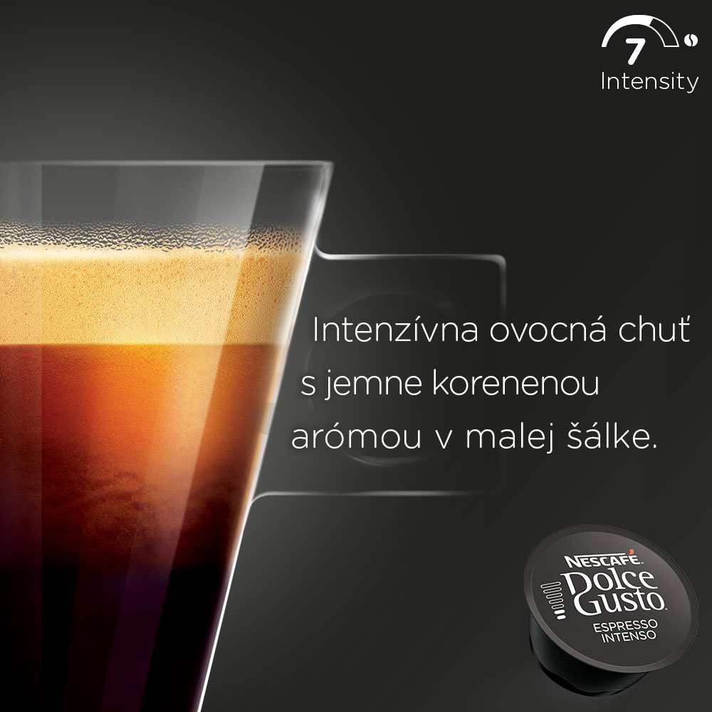 Objavte NESCAFÉ® Dolce Gusto® Espresso Intenso - intenzívna stredne tmavo praženú kávu. Táto malá káva s intenzitou 7/11 má ovocné a korenenú arómu, jemné telo a bohatú zamatovú cremu. Zmiešaním zrniek juhoamerickej kávy arabika sa zrnkami kávy robusta vytvorili naši talentovaní tvorcovia kávu NESCAFÉ® Dolce Gusto® Espresso Intenso s unikátnou kombináciou intenzívneho arómy a hebkého tela.