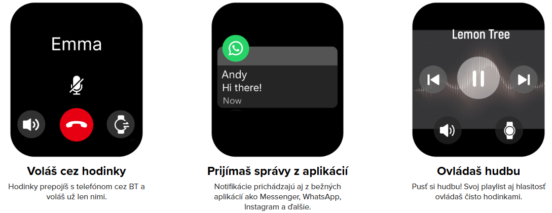 Telefón nechaj schovaný v taške. S hodinkami môžeš hovory prijímať aj telefonovať – majú vlastný mikrofón a reproduktor. S svetom si tak stále prepojený aj v ďalších appkách. Notifikácie z telefónu sa zobrazujú priamo na displeji hodiniek. Tak ti už nič dôležité neunikne!