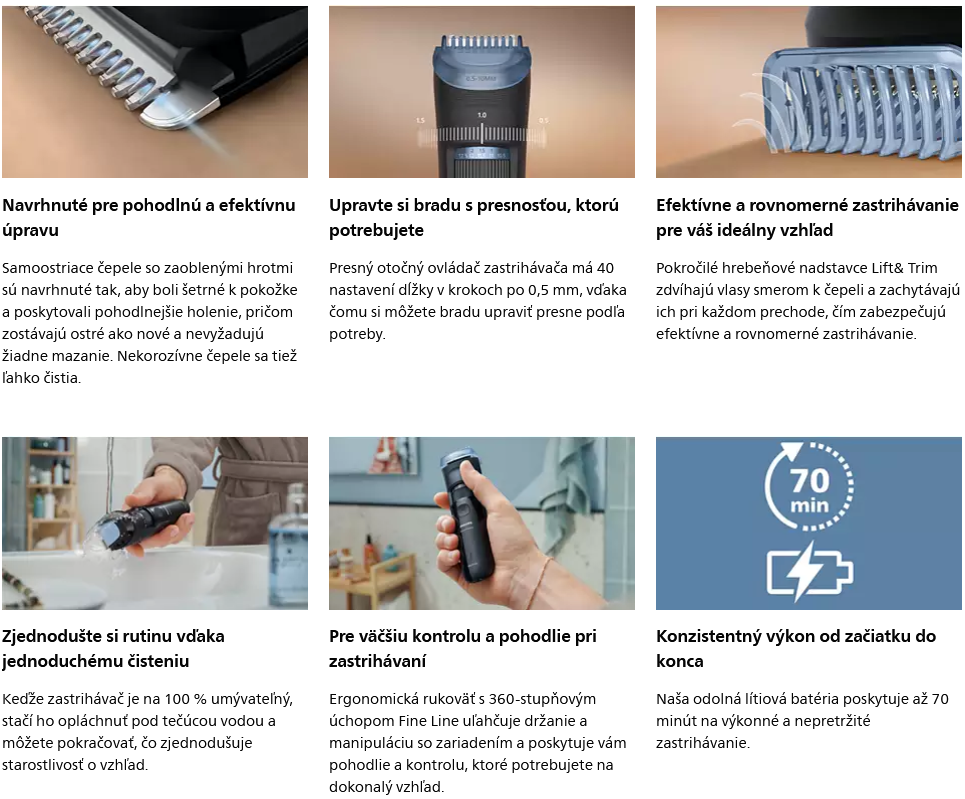 Vždy rýchlo a pohodlne. Zaoblené špičky ponúkajú jemné zastrihávanie a samoostriace čepele ho urýchľujú, keďže po pokožke nemusíte prejsť viackrát. Navyše vďaka 40 nastaveniam dĺžky získate maximálnu presnosť, ktorú chcete.