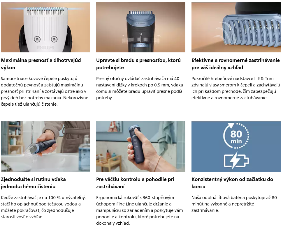 Rýchle a presné zastrihávanie. Samoostriace kovové čepele poskytujú lepšiu odolnosť s cieľom zaistiť maximálnu presnosť počas zastrihávania. Navyše vďaka 40 nastaveniam dĺžky získate maximálnu presnosť, ktorú chcete.