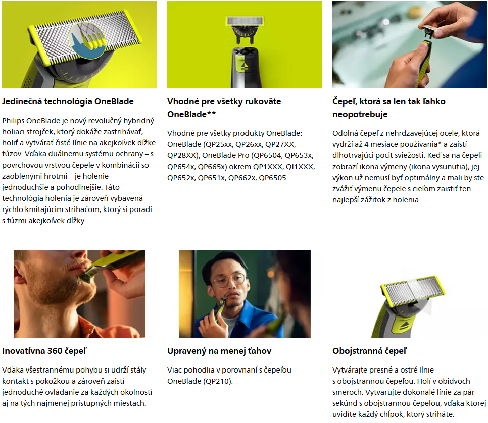 | Kompatibilita: | Vhodné pre všetky produkty OneBlade: OneBlade (QP25xx, QP26xx, QP27XX, QP28XX), OneBlade Pro (QP6504, QP653x, QP654x, QP665x) okrem QP1XXX, QI1XXX, QP652x, QP651x, QP662x, QP6505 |