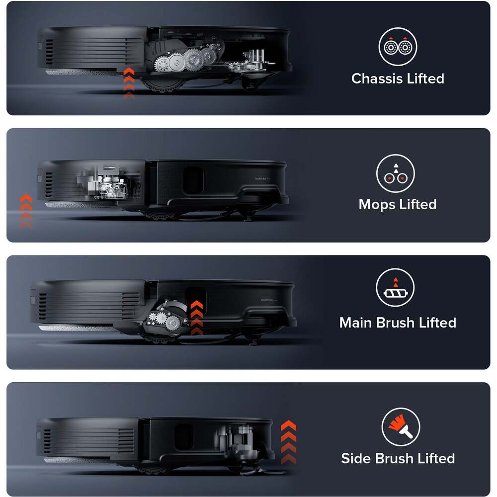 Technológia AdaptiLift s nezávislým trojkolesovým systémom umožňuje zdvíhať celé telo robota alebo nastavovať výšku jednotlivých častí. Vysávač sa tak dokonale prispôsobí každému povrchu a bez problémov prekoná prekážky.