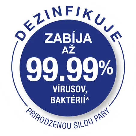 ÚPLNE PRÍRODNÝ DEZINFEKČNÝ ÚČINOK: Parný výkon osviežuje a dezinfikuje a zabije až 99,9 % vírusov, baktérií a choroboplodných zárodkov* pre dokonalú domácu hygienu. *Externé testy sa uskutočnili v nezávislých laboratóriách, priložením prístroja na bavlnenú tkaninu a pomalým naparovaním trikrát tam a späť.