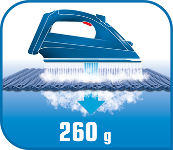 Intenzívny parný ráz 260 g/min. pomáha pri žehlení hrubých látok a ľahko si poradí aj s najodolnejšími záhybmi.