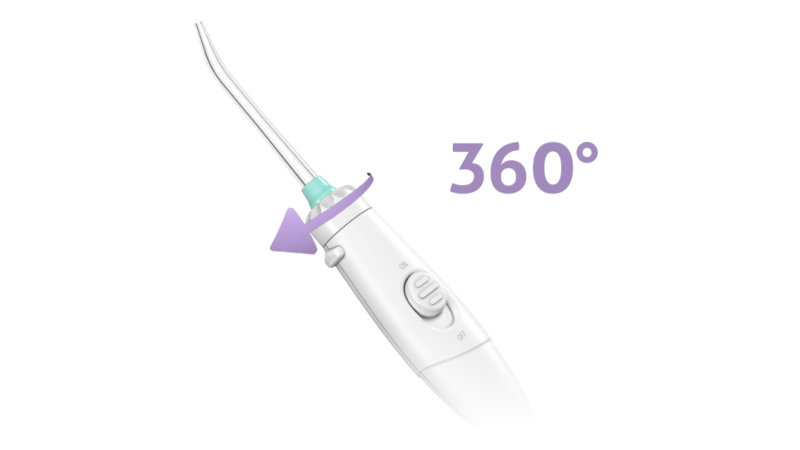 Otočná hlavica 360° Hlavica trysky je otočná o 360 stupňov, takže jednoducho vyčistí všetky zákutia vašich úst. |