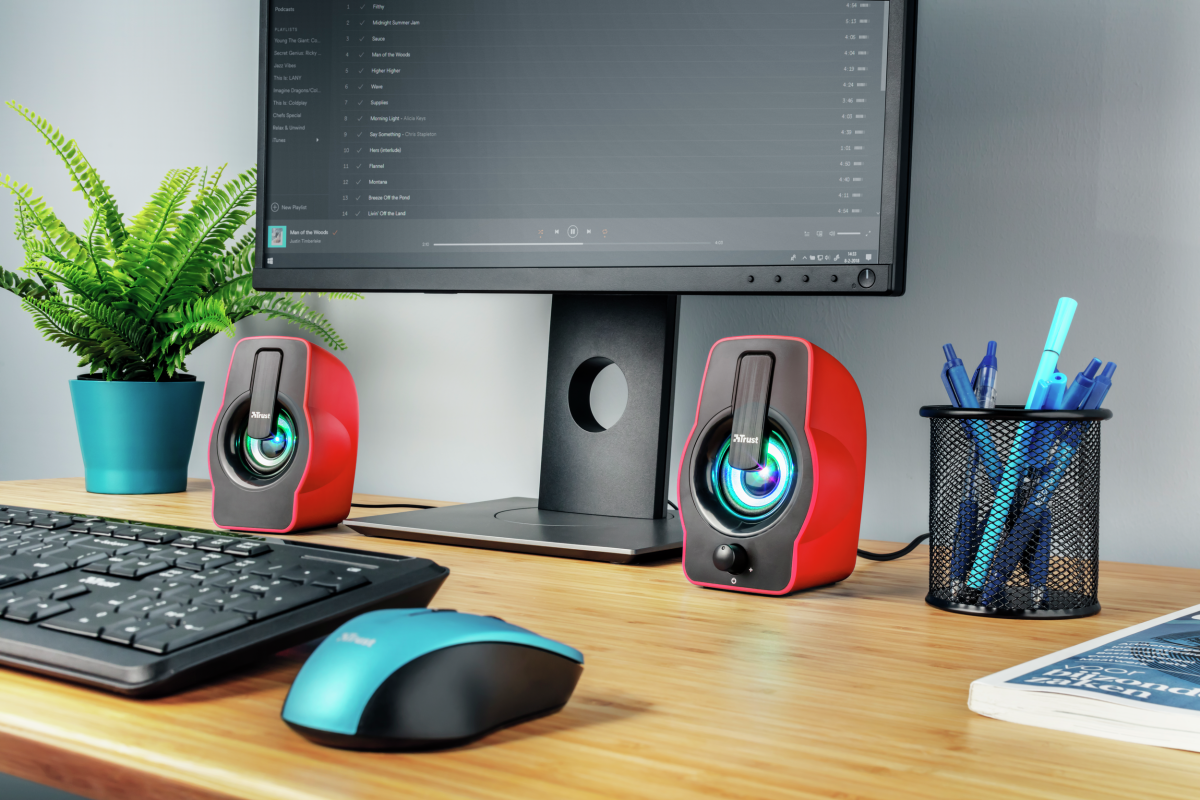 Gemi pracuje s každým PC alebo notebookom a je napájaný cez USB, čo znamená, že reproduktory môžete inštalovať veľmi jednoducho. Jednoducho pripojte 140 cm USB kábel a 3,5 mm audio kábel a je pripravený na použitie: nie je potrebný žiadny nástenný zdroj. Po pripojení reproduktora sa rozsvieti automatizovaný farebný cyklus RGB. Môžete zapnúť alebo vypnúť reproduktory a nastaviť hlasitosť pomocou tlačidla umiestneného na prednej strane. Je to farebný doplnok ku každému stolu!