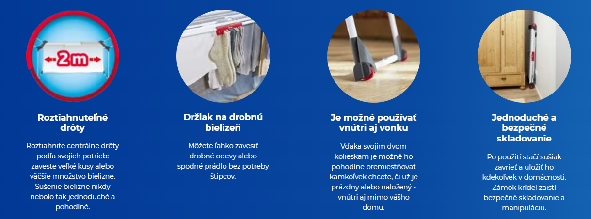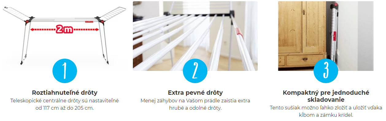 Vďaka novej technológii sú teleskopické drôty extrémne odolné, trvanlivé a ultra silné. Vzhľadom k ich hrúbke zostáva na bielizni menej záhybov, čo vám urýchli následné žehlenie. Pevné paralelné nohy poskytujú veľkú stabilitu, aj keď je sušiak plne roztiahnutý a naložený. Jeho nové praktické kĺby sú plne zmontované, aby poskytli ešte vyššiu stabilitu a zabezpečili ľahké zatváranie a otváranie Infinity Flex. Pre ešte väčšiu bezpečnosť disponuje sušiak bezpečnostným zámkom krídel a vyhnete sa tak náhodnému otvoreniu sušiaku.