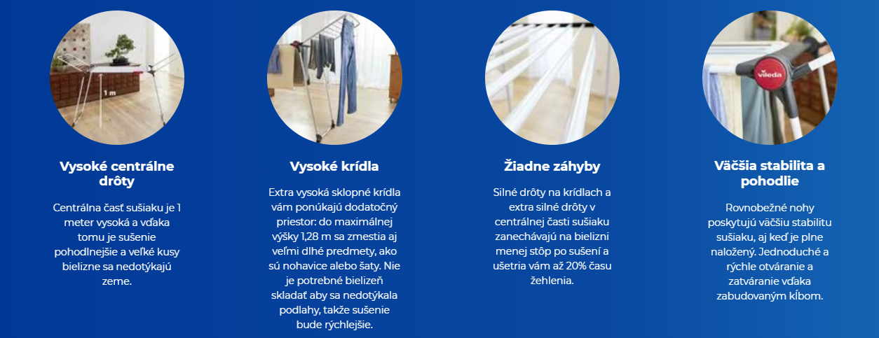 So sušiakom Vileda Infinity Flex je sušenie vašej bielizne pohodlnejšie než kedykoľvek predtým. Flexibilný sušiak je možné roztiahnuť a dosiahnuť tak maximálnu sušiacu plochu až 30 metrov pre pohodlné a praktické použitie. Potrebujete sušiť obrusy, plachty alebo veľké množstvo bielizne? Vďaka teleskopickým centrálnym drôtom (roztiahnuteľným od 117 do 205 cm) môžete veľké predmety ľahko zavesiť, bez toho aby ste ich museli skladať. A pretože je sušiak vysoký až 1 meter Vaša bielizeň sa nedotýka zeme.