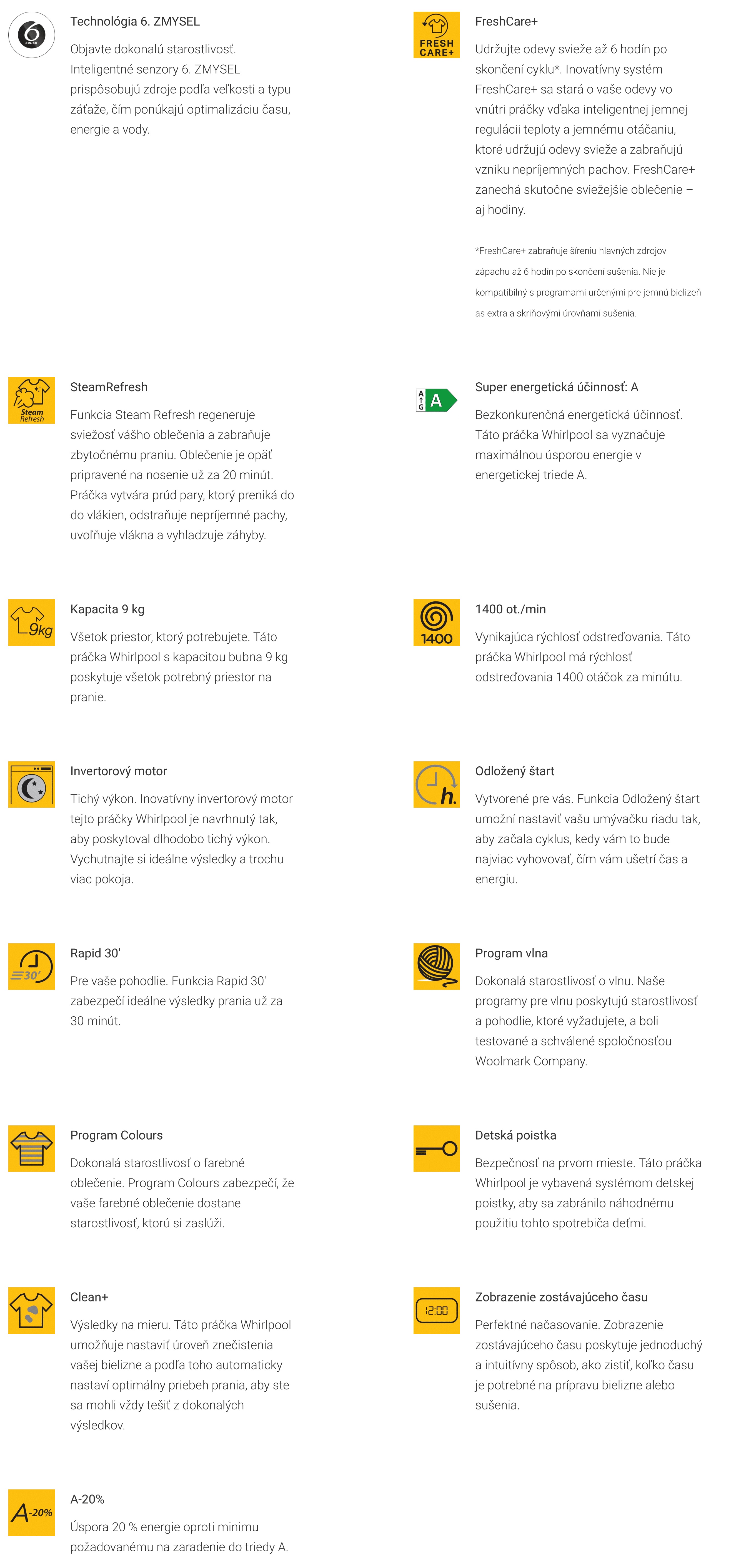 Vždy svieže - funkcia FreshCare+ zaisťuje vždy sviežu bielizeň až 6 hodín po skončení pracieho cyklu a zabraňuje tvorbe nepríjemného zápachu.