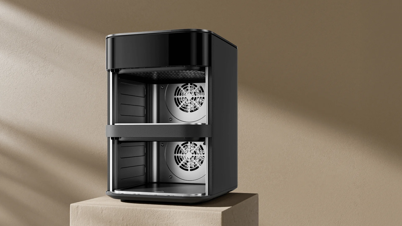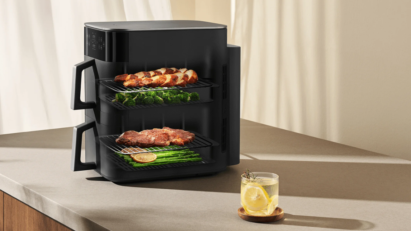 Uloženie dvoch košov vertikálne je priestorovo efektívnejšie ako umiestnenie vedľa seba. Fritéza šetrí približne 35 % horizontálneho priestoru v porovnaní s Xiaomi Dual Zone Air Fryer 10L.
