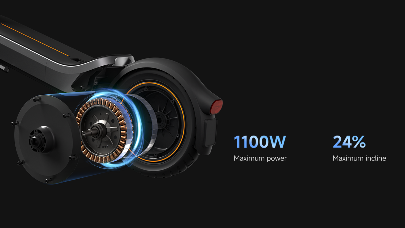 Kolobežka je vybavená bezuhlíkovým motorom s výkonom až 1100W a pohonom zadného kolesa, ktorý zabezpečuje bleskové zrýchlenie a stabilne vysoký výkon počas celej jazdy. Vďaka vysokému výkonu ponúka stúpenie až do 24%.